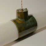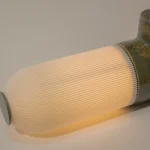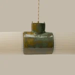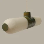 The Submarine Pendant by Streicher Goods is a hand-made ceramic pendant light featuring two elongated, ribbed 3D-printed shades. The central ceramic piece, finished with a textured glaze, serves as both a structural and decorative element. The minimalist design emphasizes the blend of traditional ceramic craftsmanship and modern 3D-printing technology, creating a unique and striking lighting fixture.