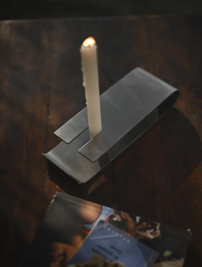 The WCH001-07 Stainless Steel Candleholder by Julian Moscoso is crafted from a single stainless steel sheet, folded 180 degrees into a seamless form. A precise cut allows a candle to stand securely, merging function with sculptural design. The polished surface interacts with light, reflecting the flickering flame and enhancing the ambiance. With its refined geometry and reflective properties, this piece transforms both light and space, serving as both a practical candleholder and a striking visual element.