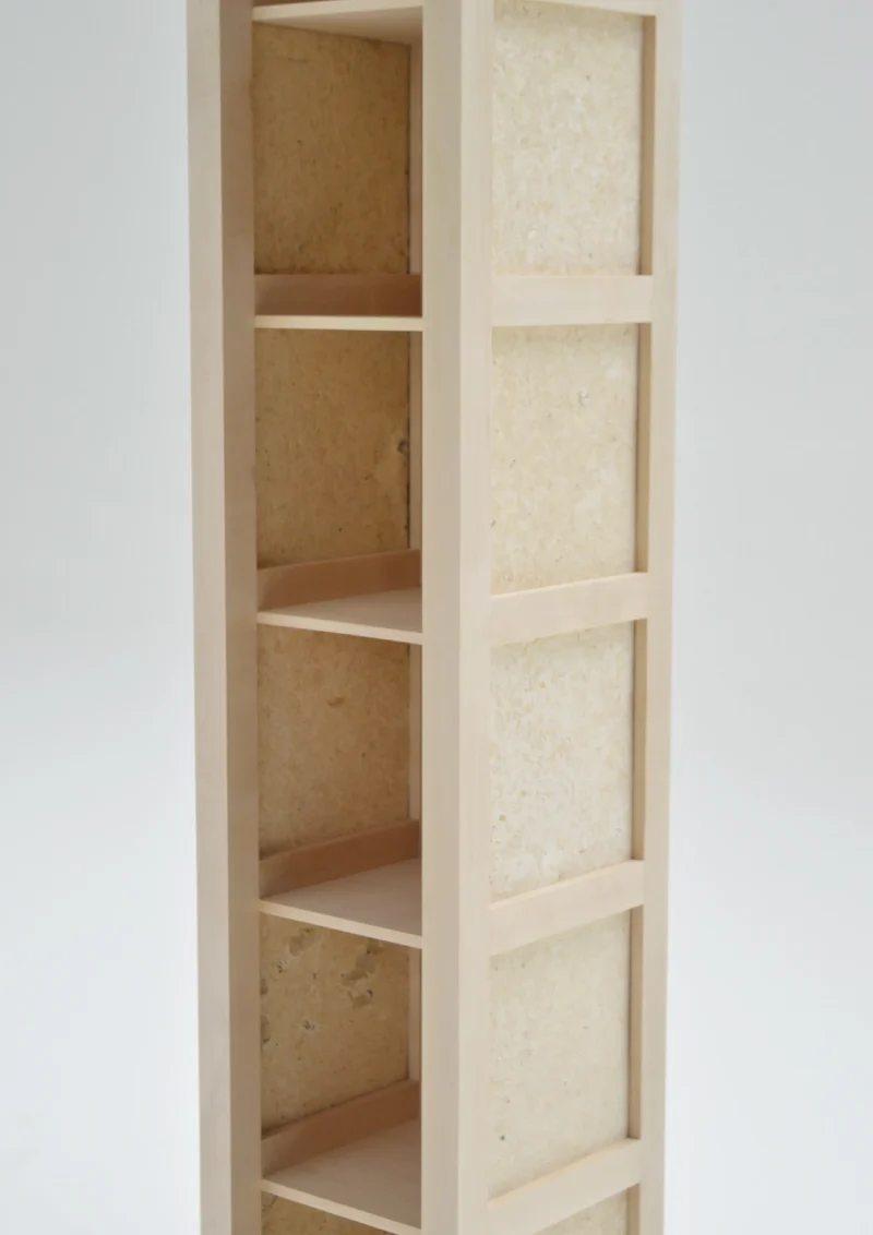 This shelf is a standout piece from the GROWN HOUSE project by Olle Sahlqvist. Drawing architectural inspiration from traditional Japanese tea houses, the construction features panels made from birch and mushroom composites. Designed with the intent to store tea or sake, this shelf reflects the project’s commitment to natural materials and minimalist aesthetics.