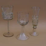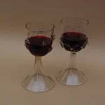 This pair of mouthblown wine goblets by Lucie Claudia Podrabska is inspired by glassware that dates back to the 15th century. In medieval times, wine goblets were not just vessels for holding liquids; they held ceremonial significance. Goblets were often used in religious rituals, feasts, and essential gatherings, and some goblets were adorned with applied decorations, such as glass trails or small blobs of glass. These embellishments not only served an aesthetic purpose of looking simply dashing but also provided additional grip when eating greasy foods with your hands.