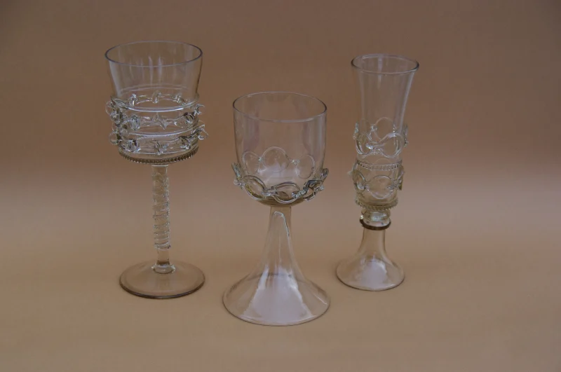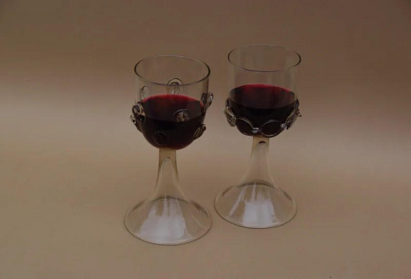 This pair of mouthblown wine goblets by Lucie Claudia Podrabska is inspired by glassware that dates back to the 15th century. In medieval times, wine goblets were not just vessels for holding liquids; they held ceremonial significance. Goblets were often used in religious rituals, feasts, and essential gatherings, and some goblets were adorned with applied decorations, such as glass trails or small blobs of glass. These embellishments not only served an aesthetic purpose of looking simply dashing but also provided additional grip when eating greasy foods with your hands.