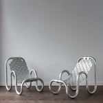 The Chainlink Chair by By Jamps is a striking fusion of industrial resilience and contemporary design, crafted for outdoor durability and sculptural impact. Constructed from anodized aluminum and galvanized steel, these chairs are reinforced with rivets, ensuring both strength and longevity while maintaining a lightweight, modern aesthetic.