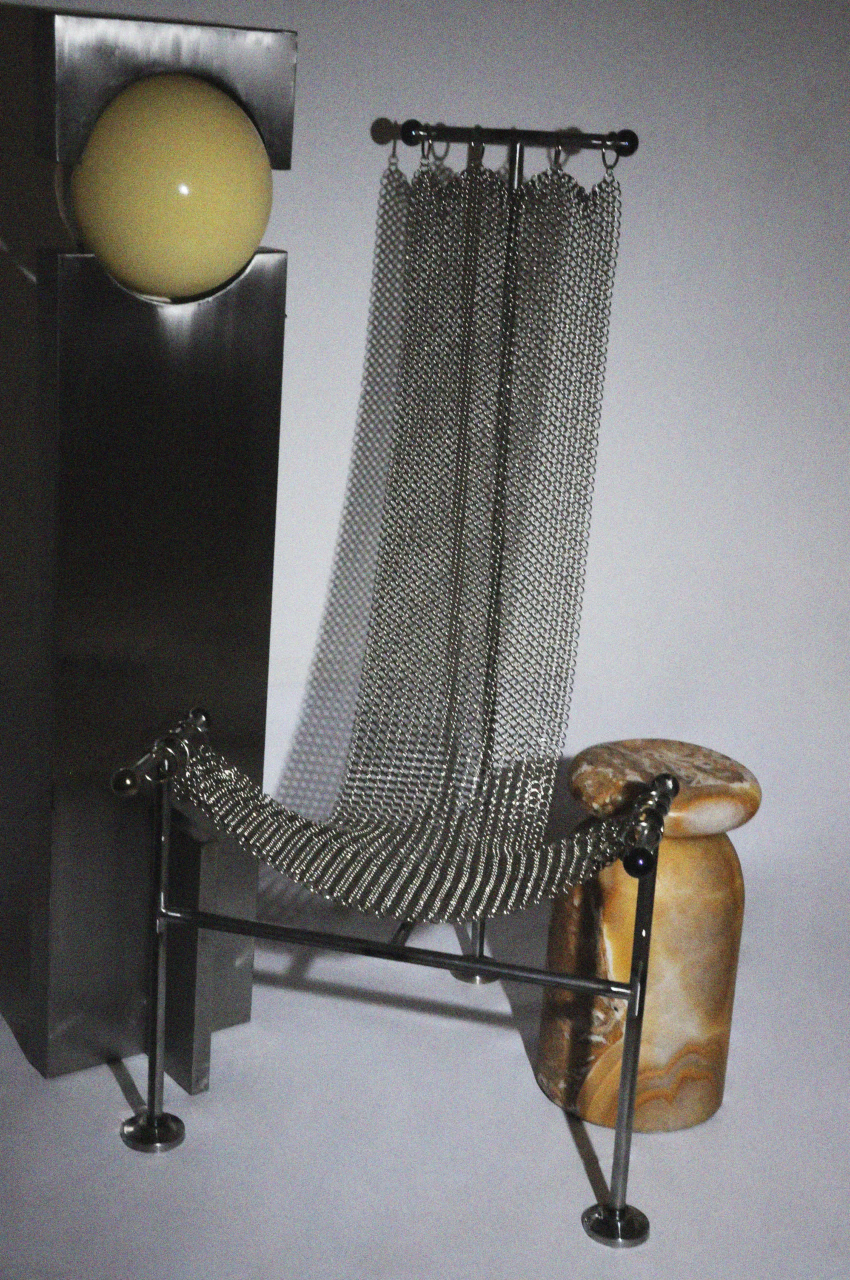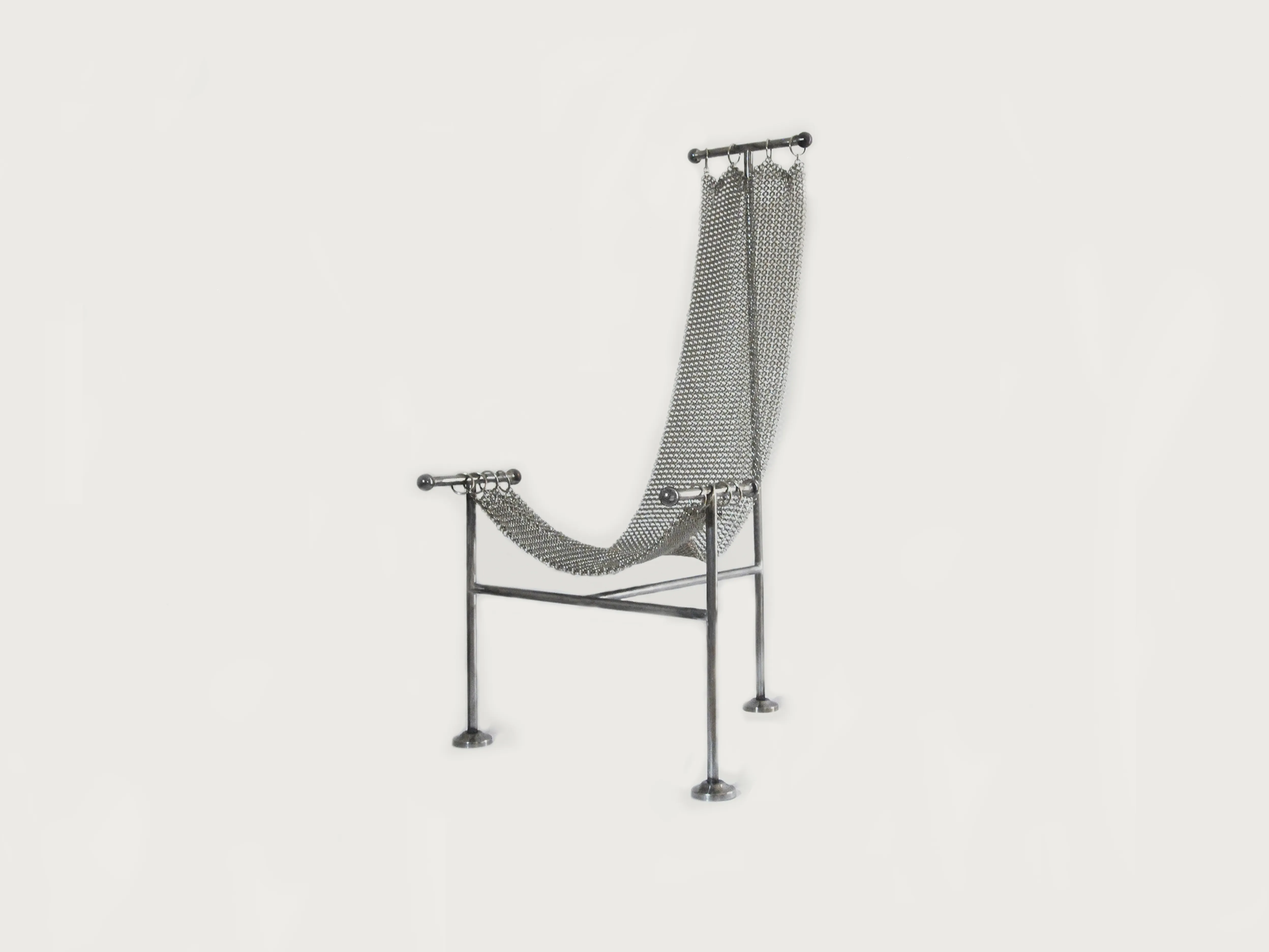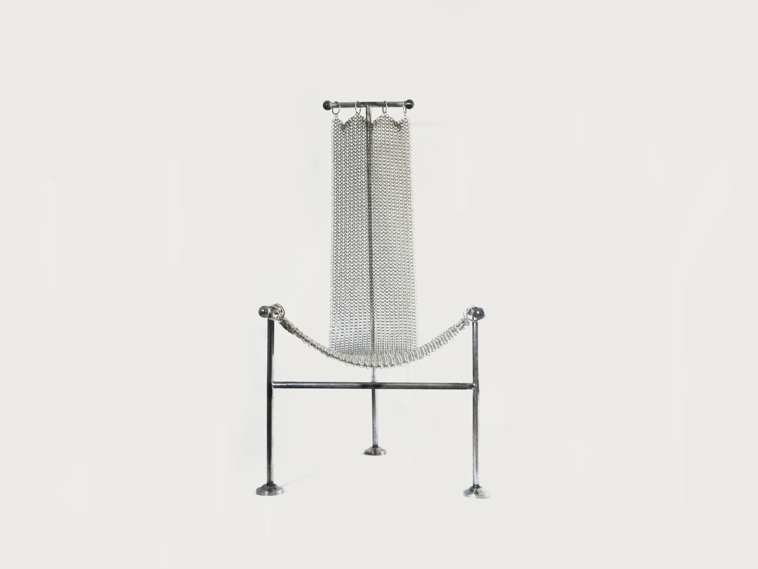 The Chainmail Chair’s design supports Felix Guattari’s concept of “a body without organs”, a body that is open to different forms of expression: to pain, to pleasure, to pleasure in pain, a body concentrated on its primal instincts. It expresses and questions our wish for constraint.
