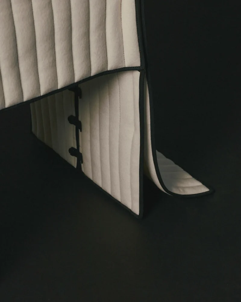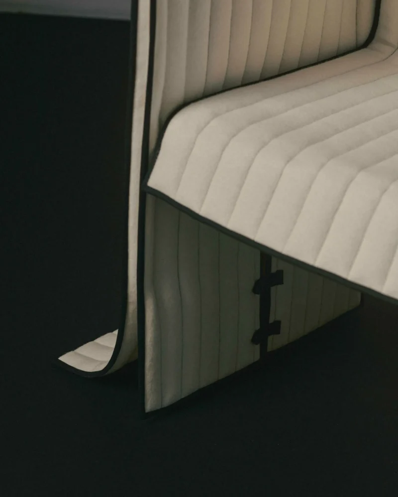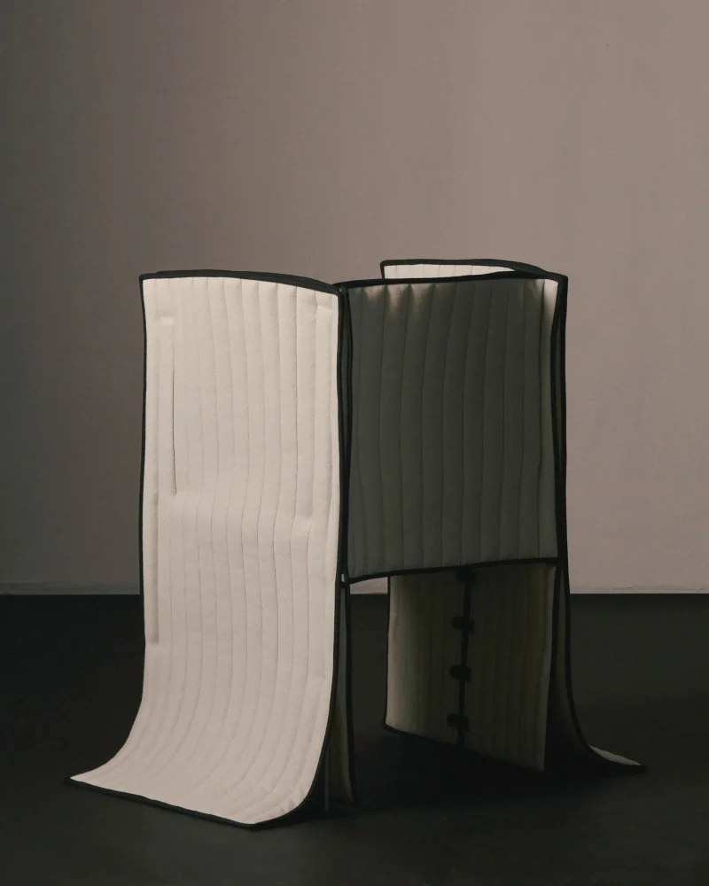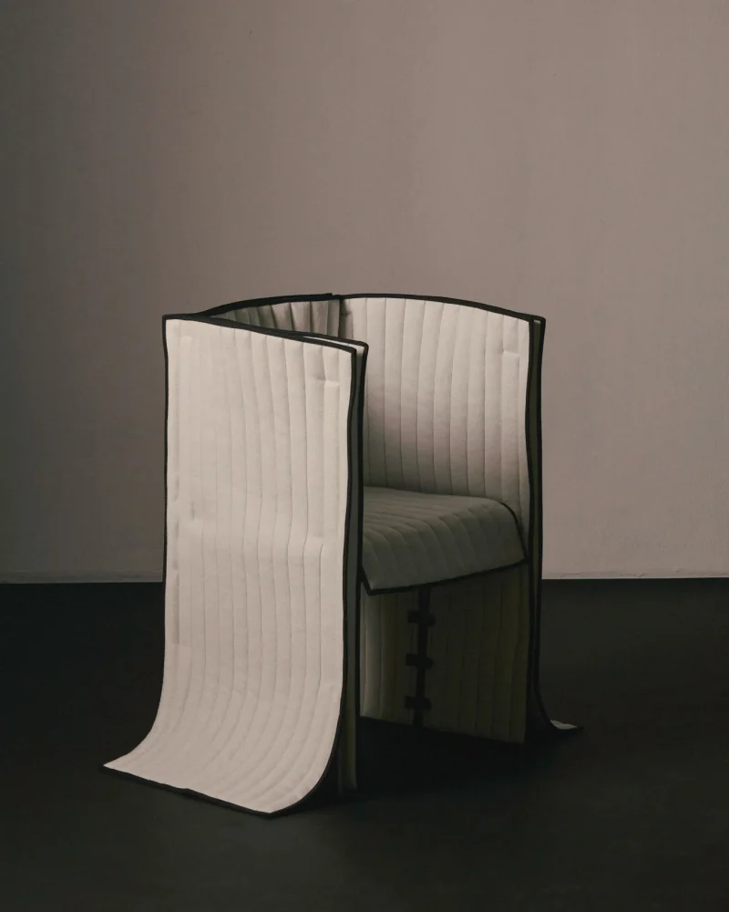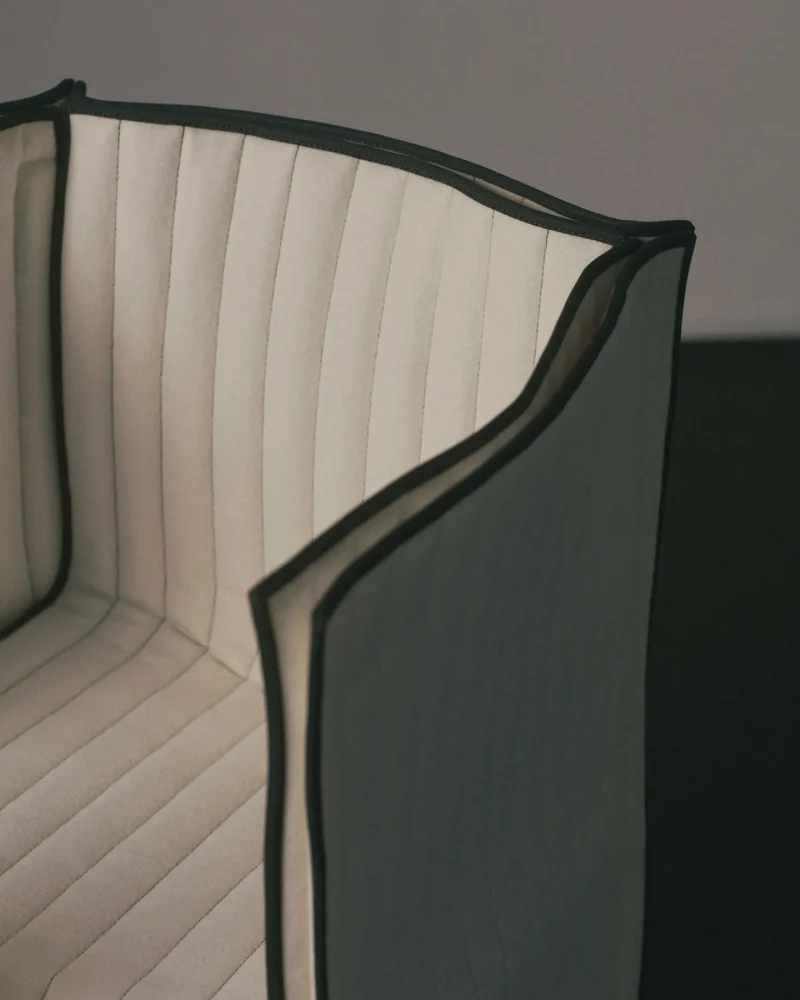 Chair In Quilt is the result of an exploration of the potential within quilt. The familiarity of the material is challenged in the encounter with the chair. As a piece of clothing the quilt wraps itself around the frame creating the shape, aesthetic and comfort of the chair. The quilt is made of Kvadrat 100% wool textile and has an aluminum frame. The quilt and frame can be separated for cleaning of the upholstery.