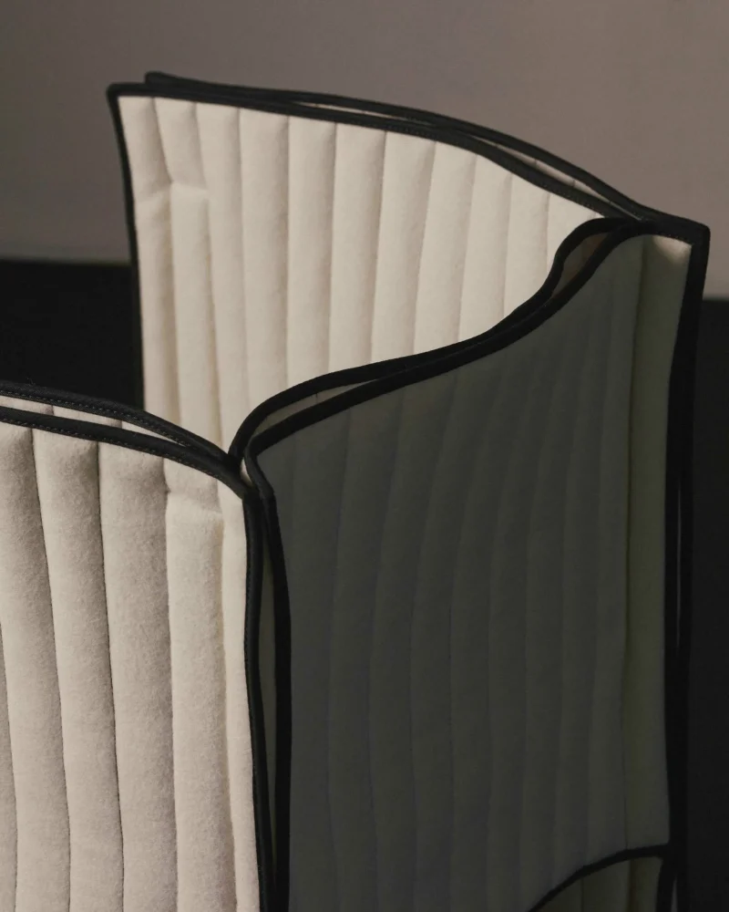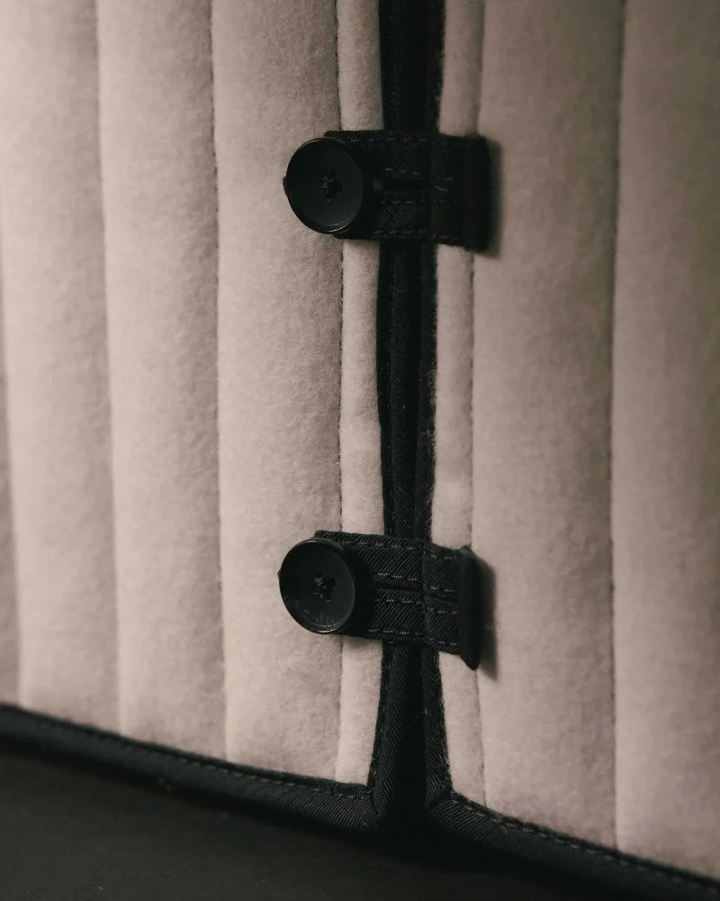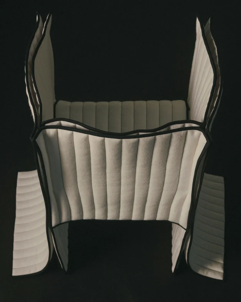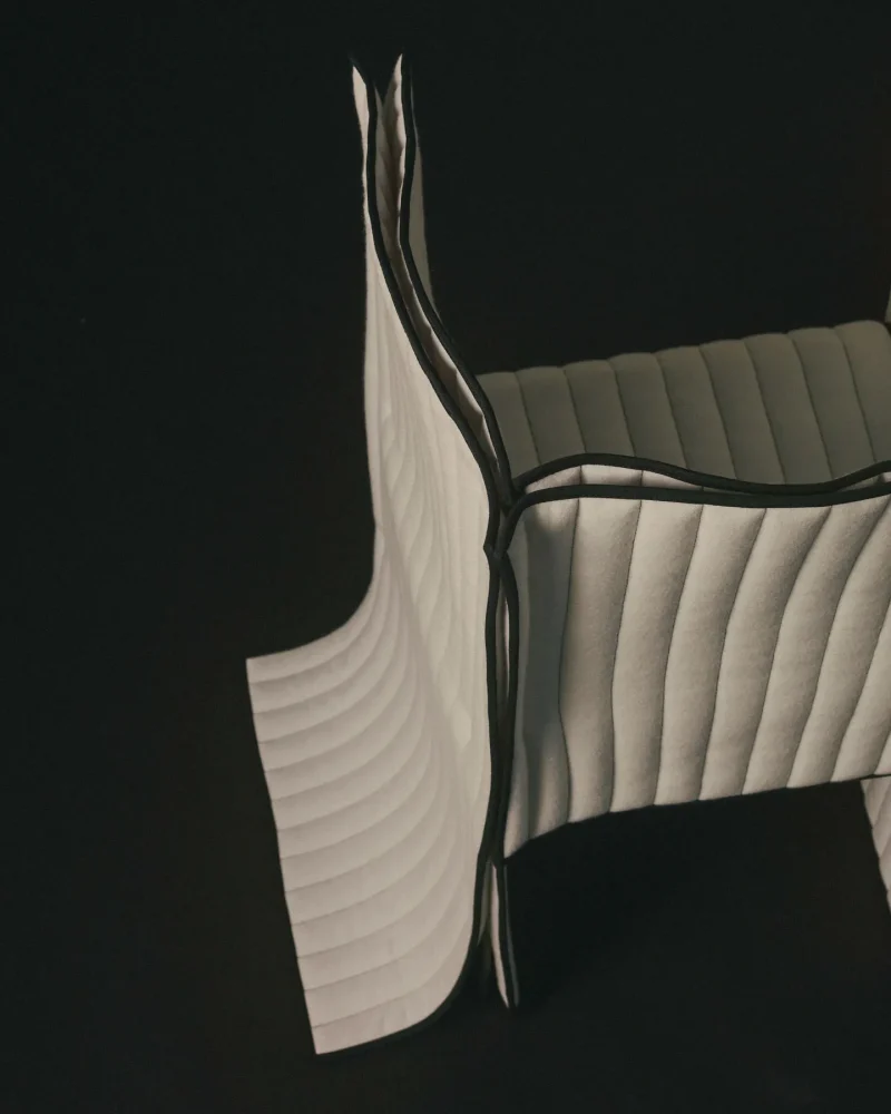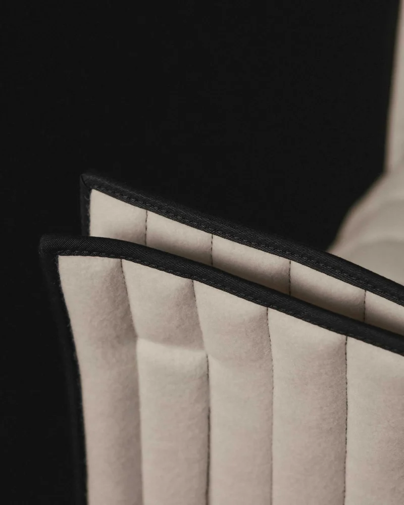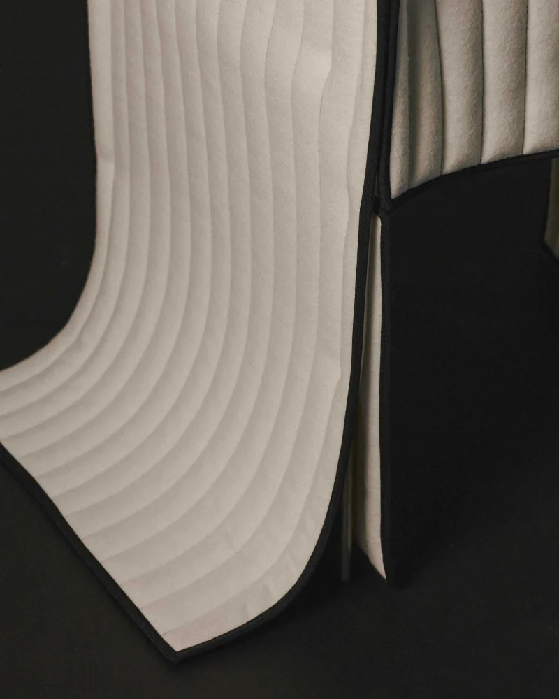 Chair In Quilt is the result of an exploration of the potential within quilt. The familiarity of the material is challenged in the encounter with the chair. As a piece of clothing the quilt wraps itself around the frame creating the shape, aesthetic and comfort of the chair. The quilt is made of Kvadrat 100% wool textile and has an aluminum frame. The quilt and frame can be separated for cleaning of the upholstery.