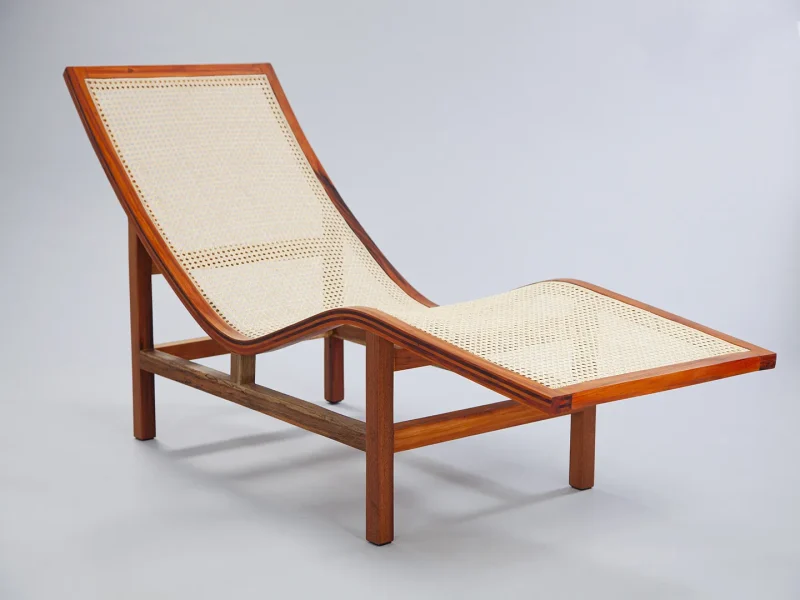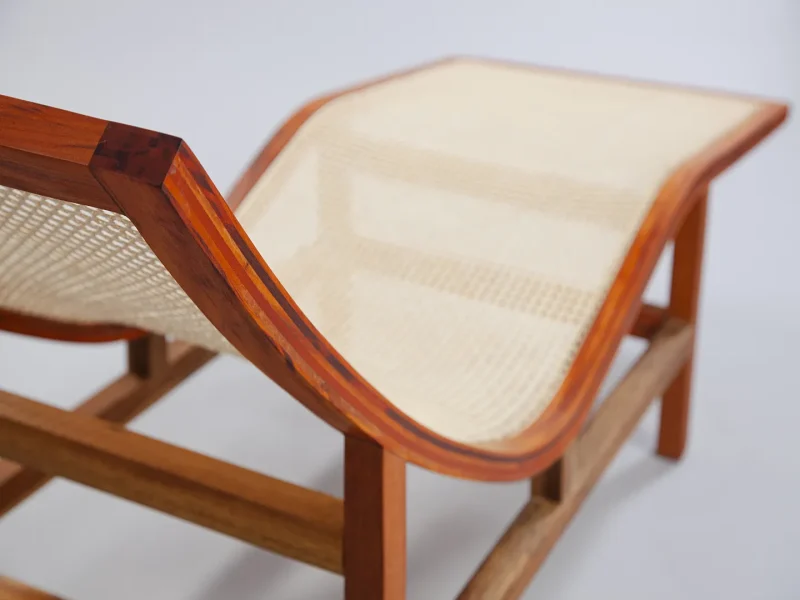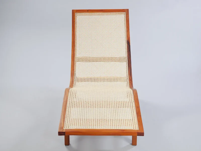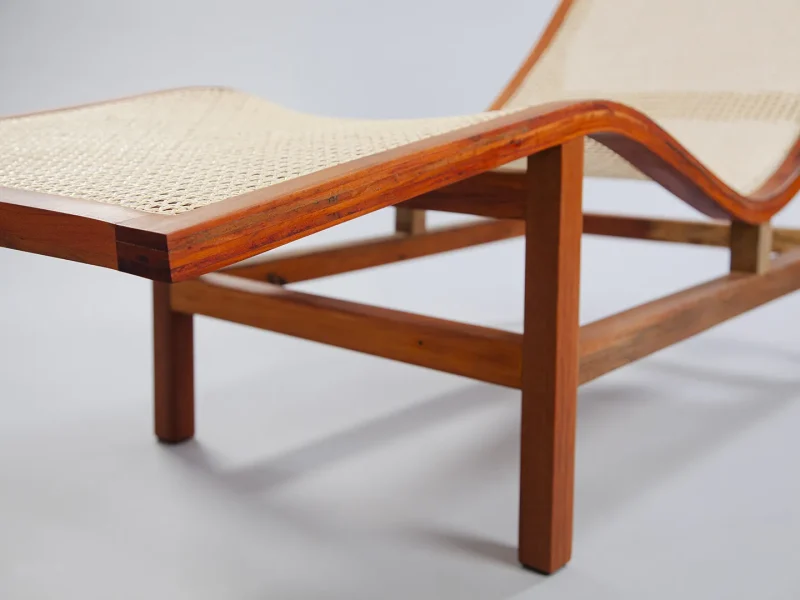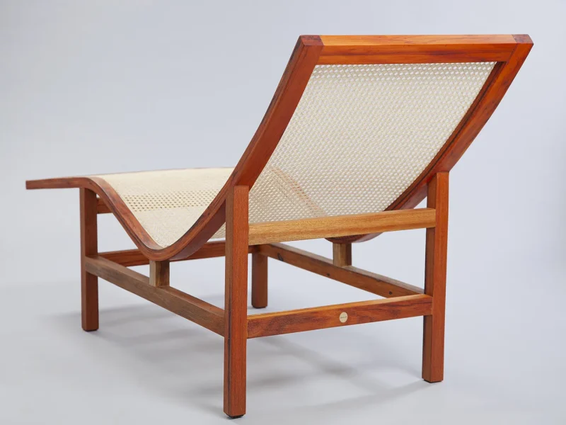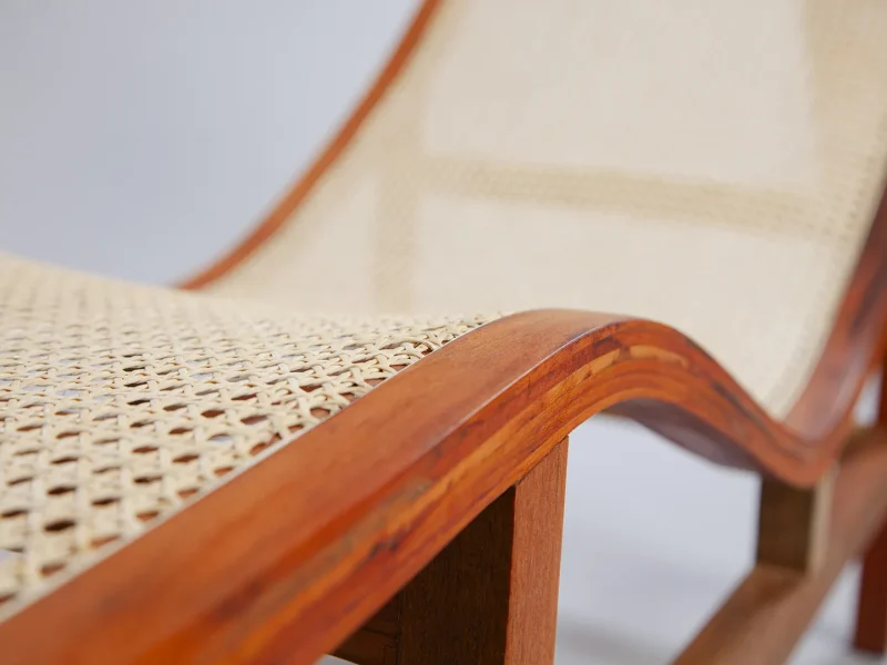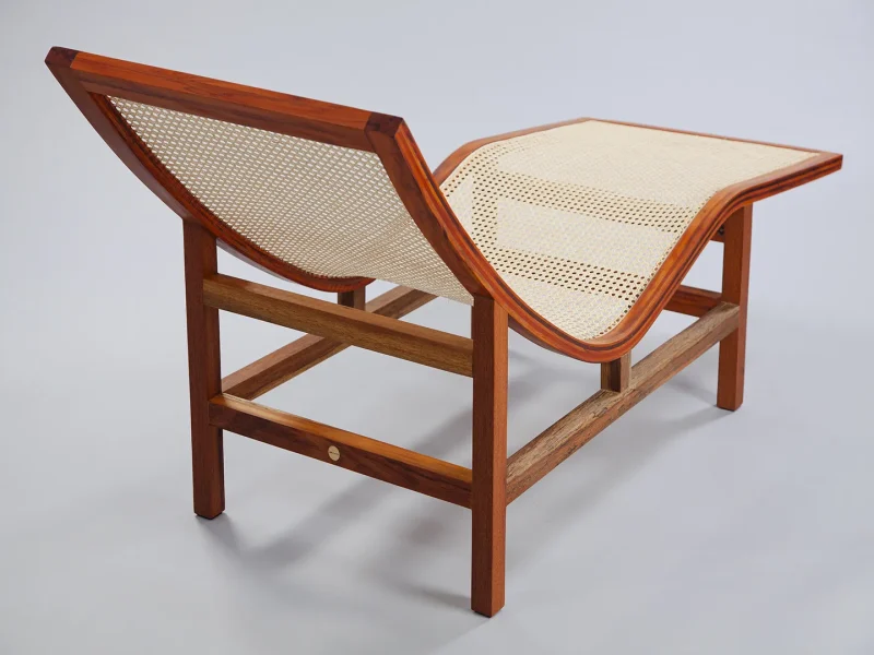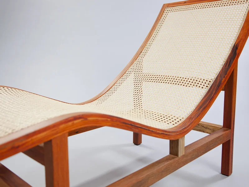 The Chaise Sossego was created to offer moments of rest with elegance and authenticity. With its organic design and construction entirely in solid wood, it combines smooth, flowing lines with the lightness and comfort of natural cane.