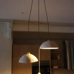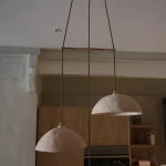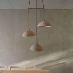 The ceramic surfaces carry a natural, tactile texture, giving the light a warm, earthy presence. Paired with brass accents and fine textile cords, the chandelier balances artisanal imperfection with timeless refinement. When illuminated, each dome casts a gentle, downlit glow that pools delicately over a dining table or gathering space, transforming the room into an intimate sanctuary.