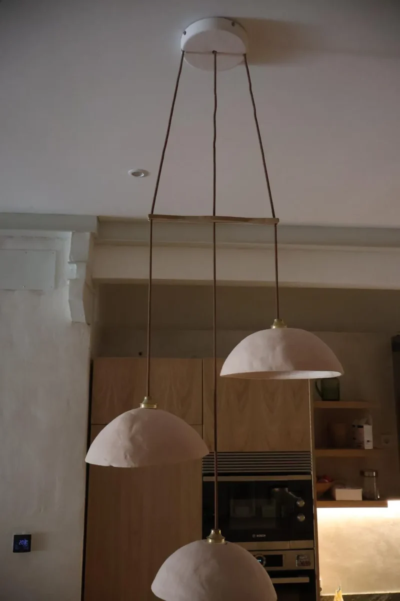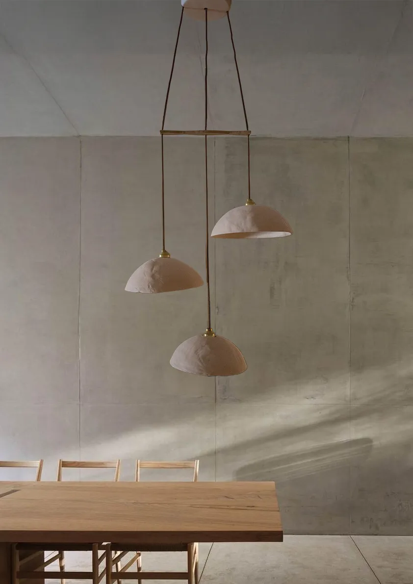 The ceramic surfaces carry a natural, tactile texture, giving the light a warm, earthy presence. Paired with brass accents and fine textile cords, the chandelier balances artisanal imperfection with timeless refinement. When illuminated, each dome casts a gentle, downlit glow that pools delicately over a dining table or gathering space, transforming the room into an intimate sanctuary.