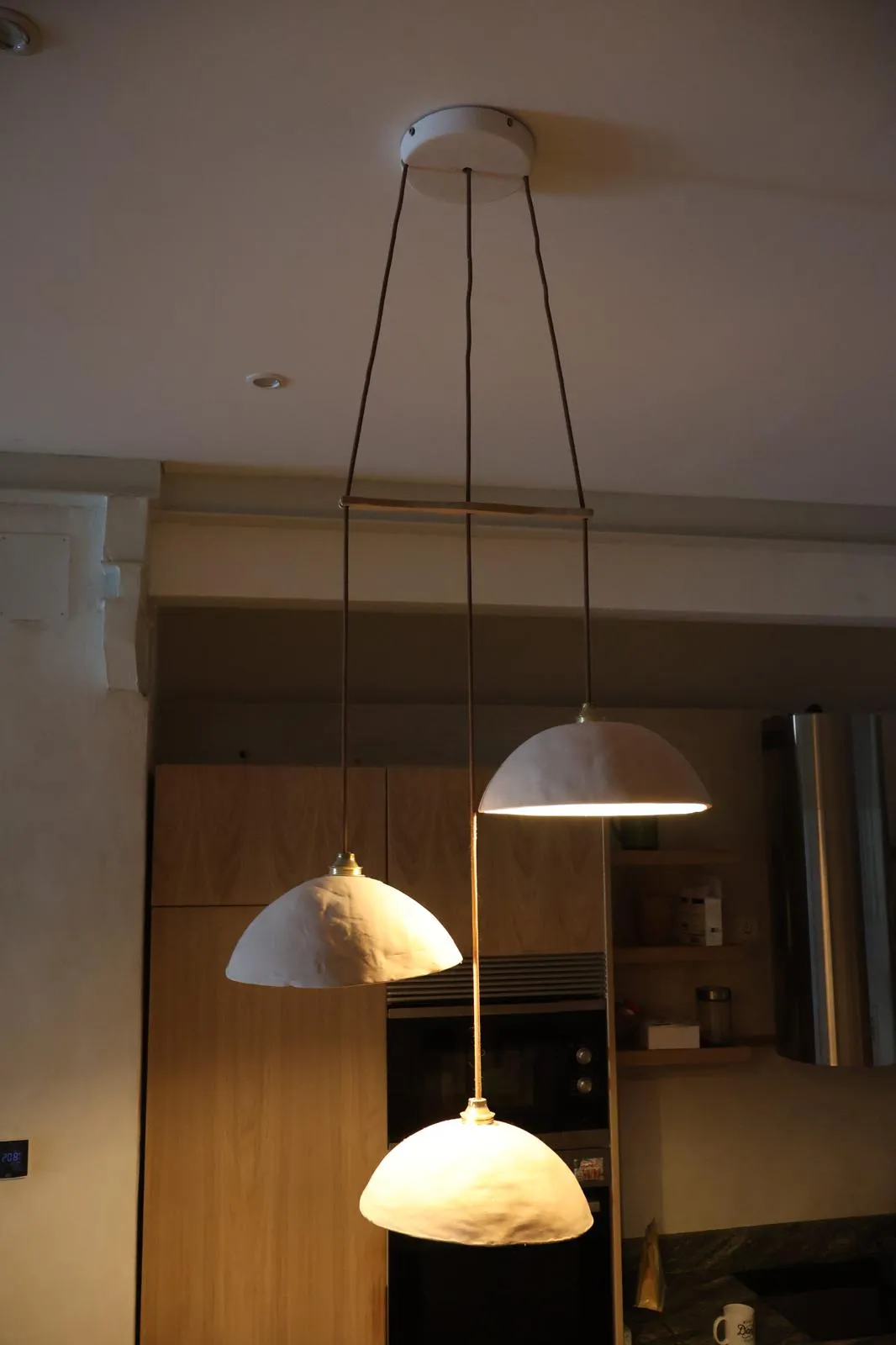 Soft, sculptural, and quietly commanding, this handcrafted ceramic chandelier brings an atmosphere of calm elegance to any room. Three dome-shaped shades—each shaped and finished by hand—float at staggered heights, creating a graceful vertical rhythm reminiscent of falling drops or softly shifting planets.