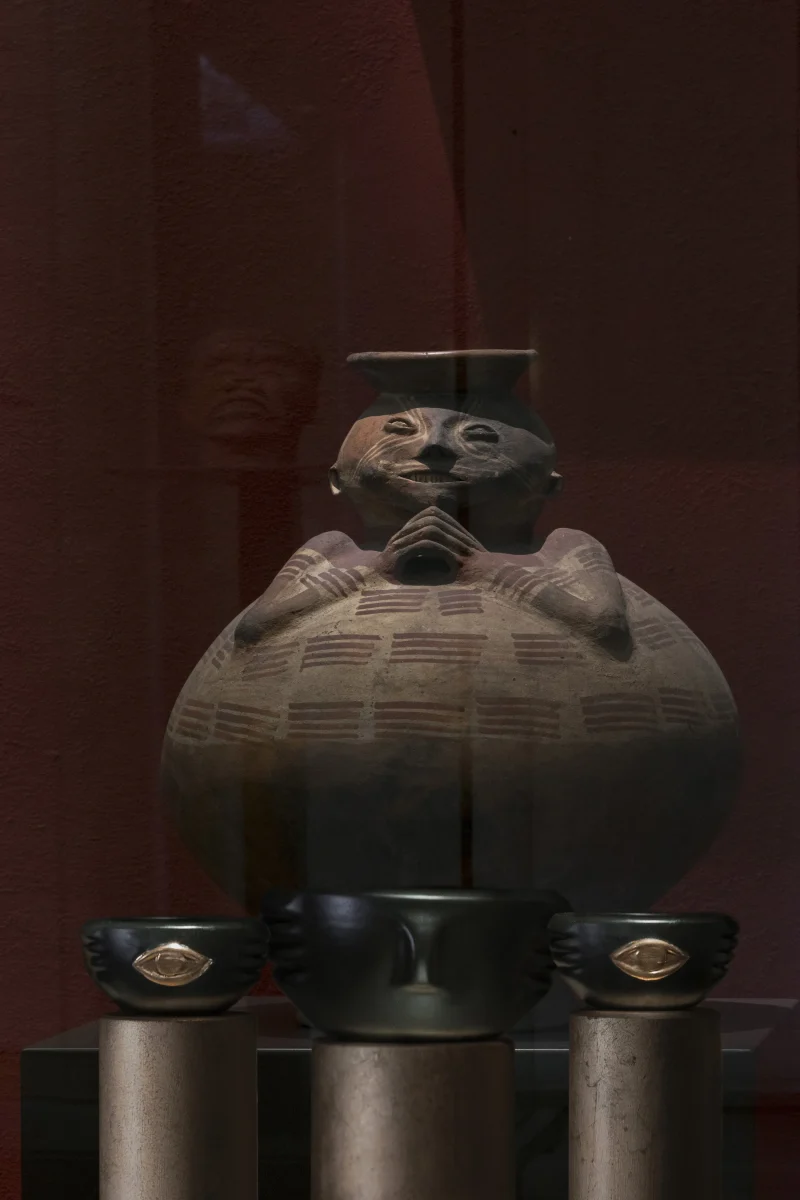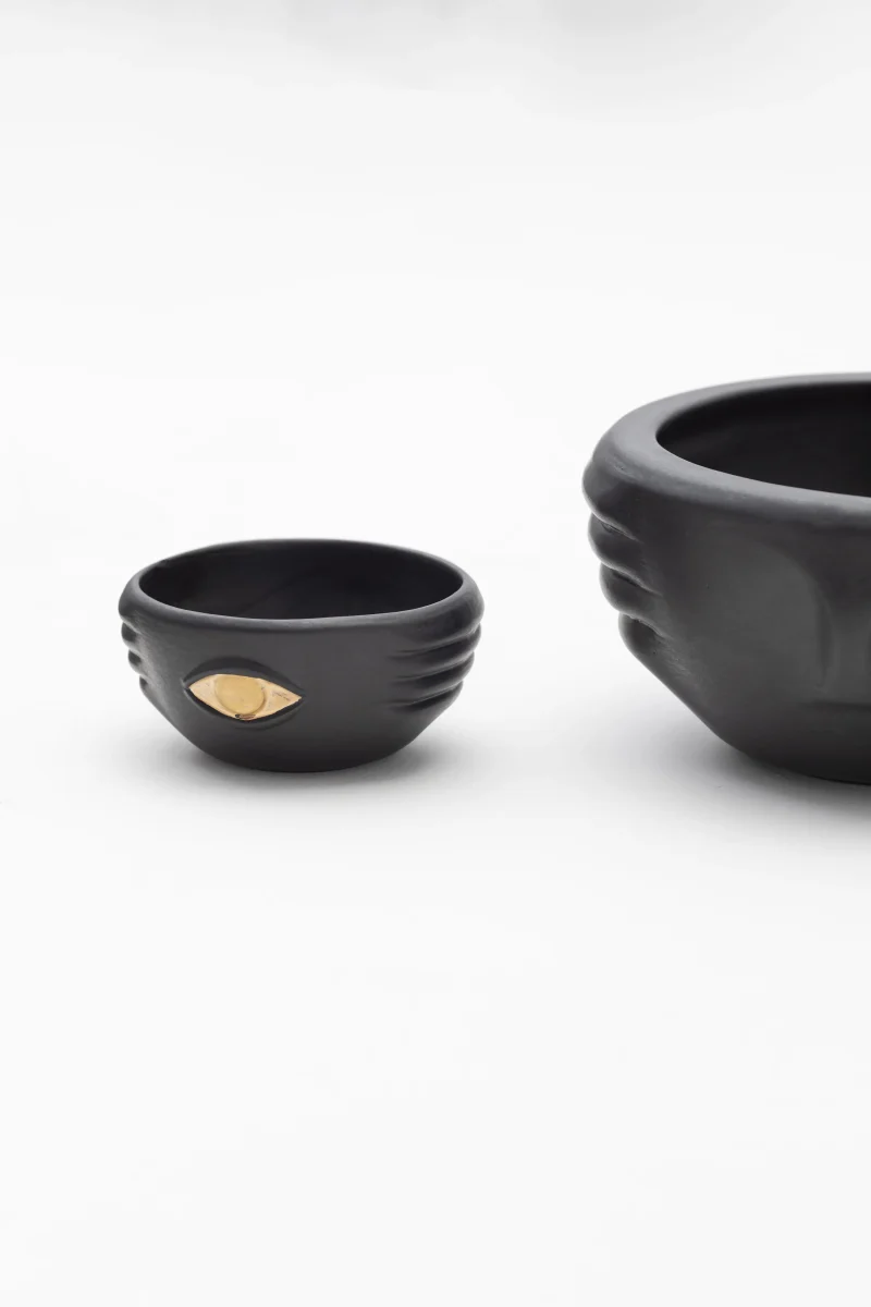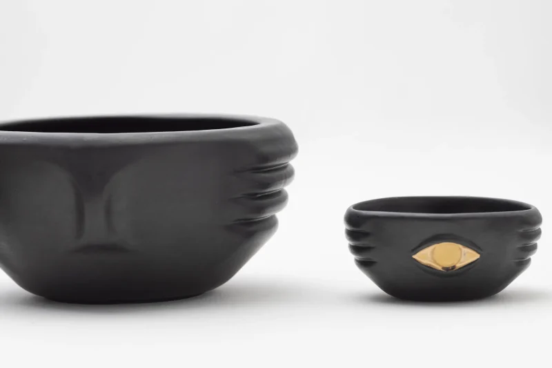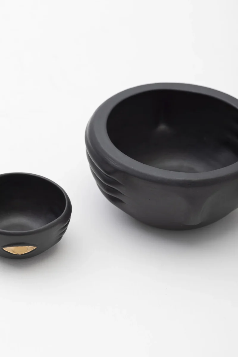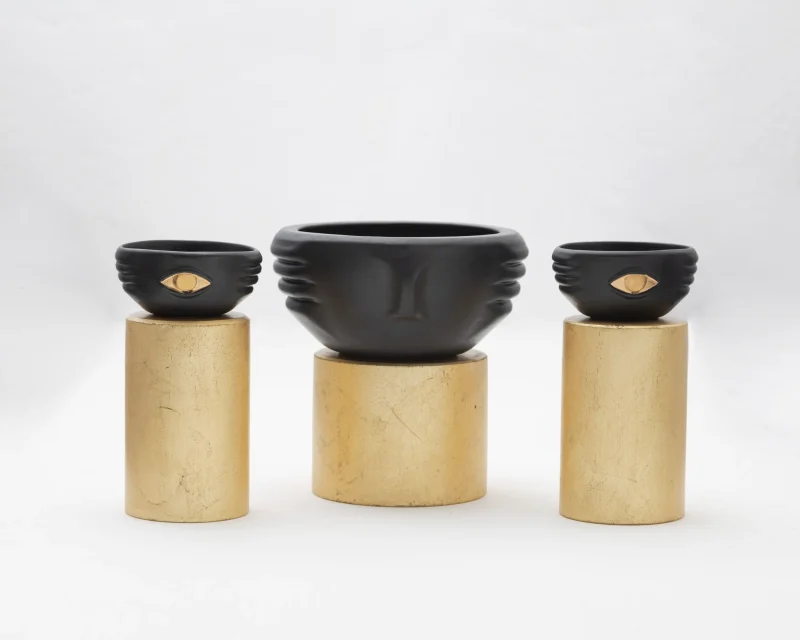 The collection features organic humanized forms meticulously handcrafted in durable slip-casted ceramics, adorned with a durable matte black glaze reminiscent of the traditional barro negro. Delicate accents in gold luster capture the cultural essence of the pre-Columbian era in form and detail, conveying the significance of gold and the sun in the region’s ancestral communities.