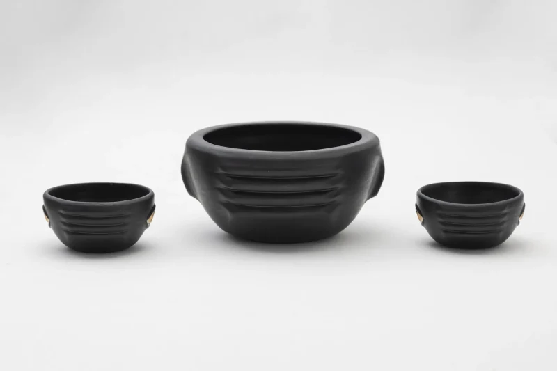 Decorative slip casted ceramic bowls finished with a rich black or dark green glaze, highlighted with gold luster details.