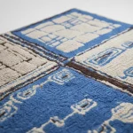 This tufted rug features a geometric grid pattern in rich shades of blue, cream, and brown. Each square contains abstract, circuit-like motifs that give the piece a contemporary, almost digital aesthetic. The high-pile texture adds warmth and softness, while the clean lines and contrasting colors create a striking visual rhythm. Perfect as a statement rug for modern interiors, it blends handcrafted texture with a graphic, design-forward look.