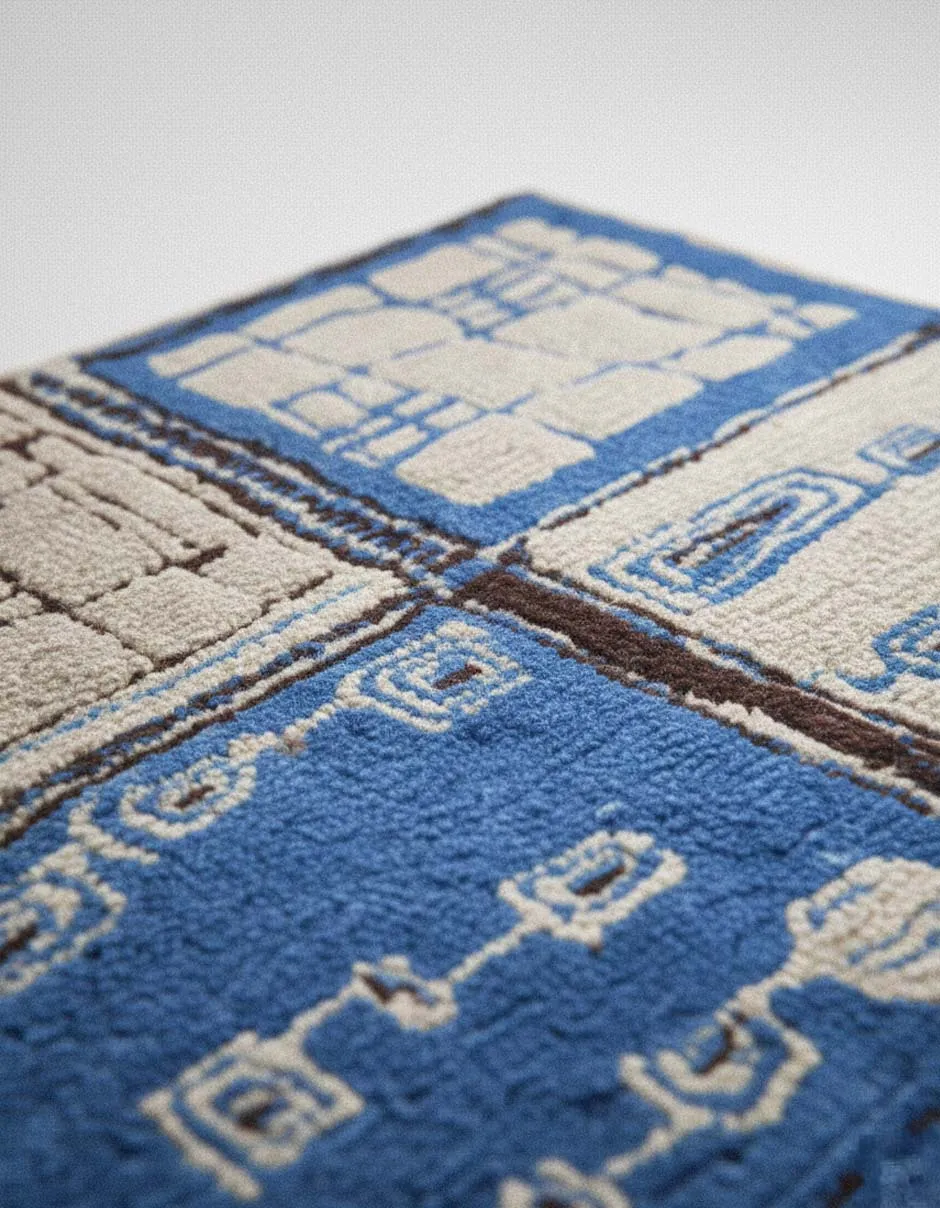 This tufted rug features a geometric grid pattern in rich shades of blue, cream, and brown. Each square contains abstract, circuit-like motifs that give the piece a contemporary, almost digital aesthetic. The high-pile texture adds warmth and softness, while the clean lines and contrasting colors create a striking visual rhythm. Perfect as a statement rug for modern interiors, it blends handcrafted texture with a graphic, design-forward look.