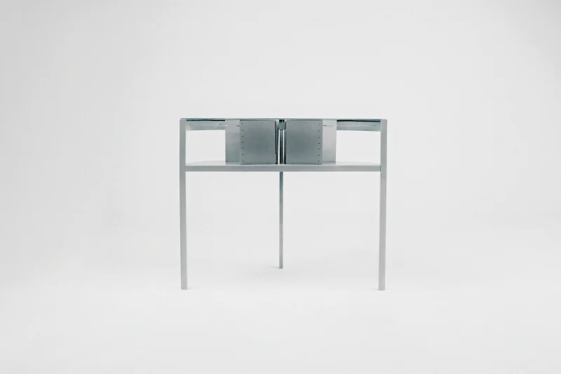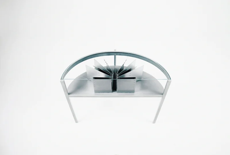 A versatile workspace designed by Hypothesis Furniture for all creators, featuring built-in storage to organize sketches, drawings, and manuscripts in A5, A4, and A3 sizes. Its semi-circular shape and transparent glass top allow you to easily track the progress of your work. The steel frame, finished in a sleek, semi-gloss gray, adds a touch of mystery to any space. Whether you’re drawing, writing, or designing, this table supports the seamless flow of your creative process. Additionally, sewing clamps allow you to adjust the area of storage compartments, providing flexible organization for your materials. This piece originated from my own reflections on the importance of creative continuity and was created with the intention of offering encouragement to all creators. Hypothesis Furniture sincerely wishes for your creative journey to thrive.