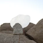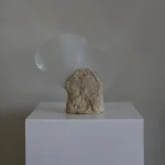 Evoking the ethereal quality of a drifting cloud, this amorphic sculpture rests on a grounded, stone-like base. A carefully carved slit reveals a fused glass element within, capturing and refracting light to create fleeting glimpses of color and luminosity. The contrast between the solid, earthy base and the delicate, radiant glass invites contemplation, as if a secret light is quietly contained within the stone. From every angle, the sculpture shifts, soft, organic curves meet the hard stone like material.