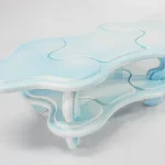 This coffee table is built from solid wood and plywood with a cloud-coloured polyurethane finish. This table is the second edition of a furniture collection that combines the aesthetics of prehistoric mega fauna with highly mechanised man-made production vehicles – proposing a new futuristic object/material language based on current developments in technology.