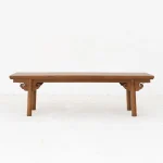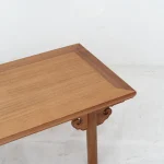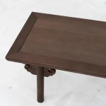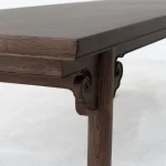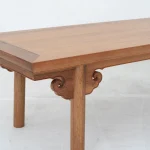 The table features embellished apron head spandrels around the legs. The tabletop includes a frame (two long edges with tenons and two short edges with mortises) and a “floating” panel. The panel floats freely in the four edges, allowing it to expand and contract with changes in temperature and humidity.