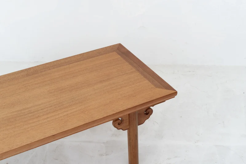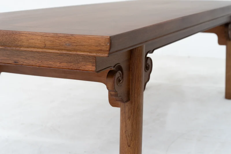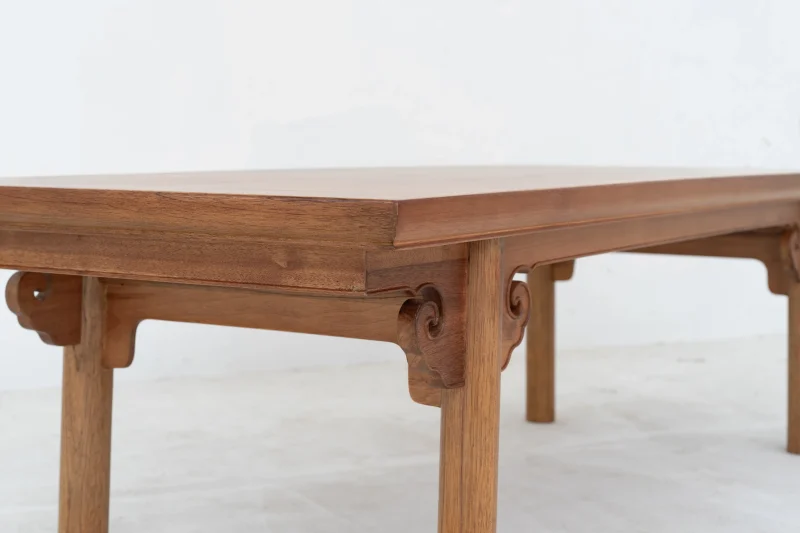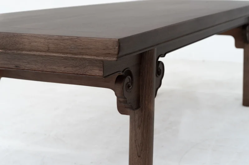 The table features embellished apron head spandrels around the legs. The tabletop includes a frame (two long edges with tenons and two short edges with mortises) and a “floating” panel. The panel floats freely in the four edges, allowing it to expand and contract with changes in temperature and humidity.