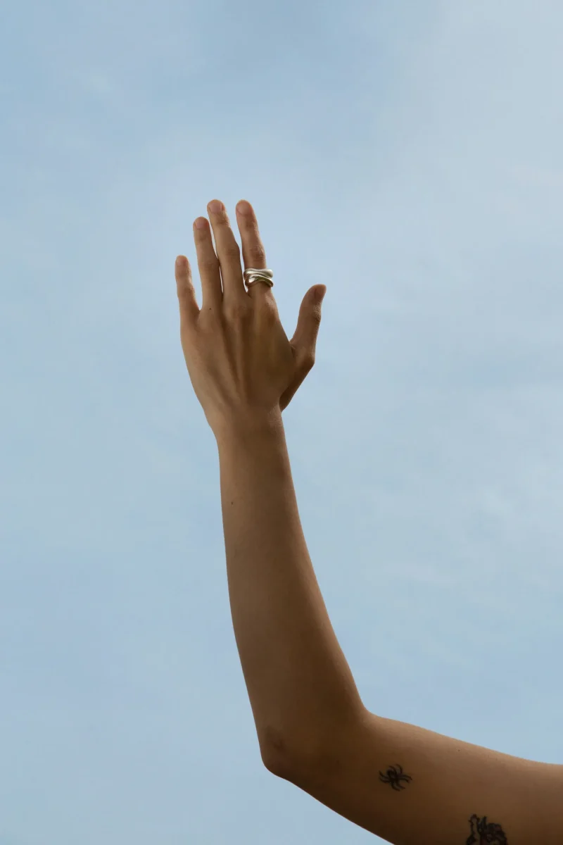 Minimalist accent ring with an organic shape. The Cloud ring takes inspiration from Anish Kapoor’s famous Cloudgate sculpture. The Cloud ring effortlessly wraps around the finger. The hard metal renders itself fluid and subdued through the organic curves of the Cloud ring. Hand carved from wax. Sterling Silver & 14k Gold Vermeil.