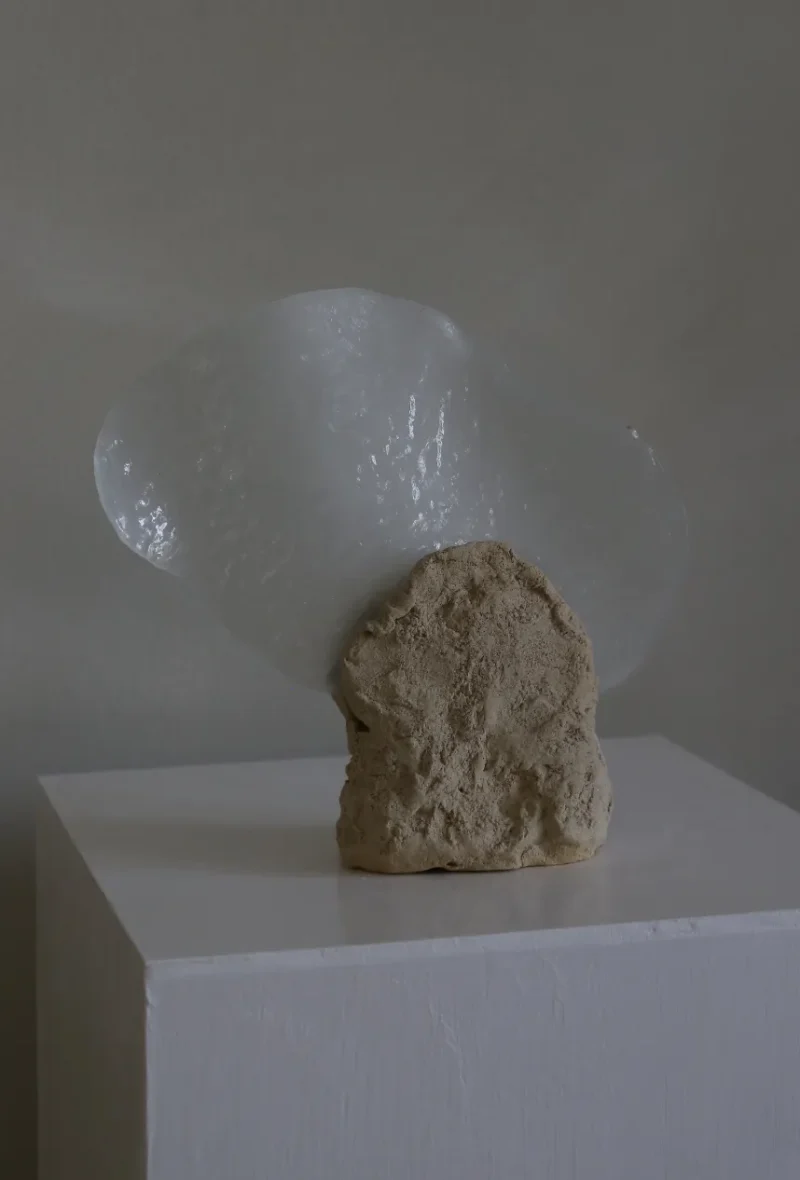 abstract ceramic amorphic sculpture carved slit ceramic cloud cloud form Contemporary sculpture earthy contrast ethereal sculpture fused glass glass inlay glowing core grounded base hard contrast hidden glass Interior decoration light refraction luminous glass organic curves poetic object quiet luminosity refracted color Sculpture secret light shifting angles soft curves stone base tactile surface
