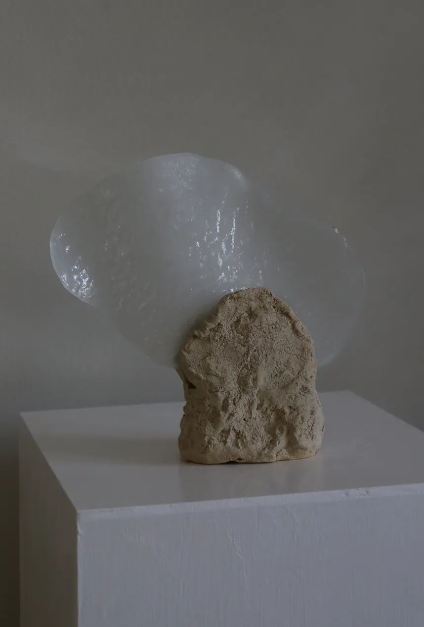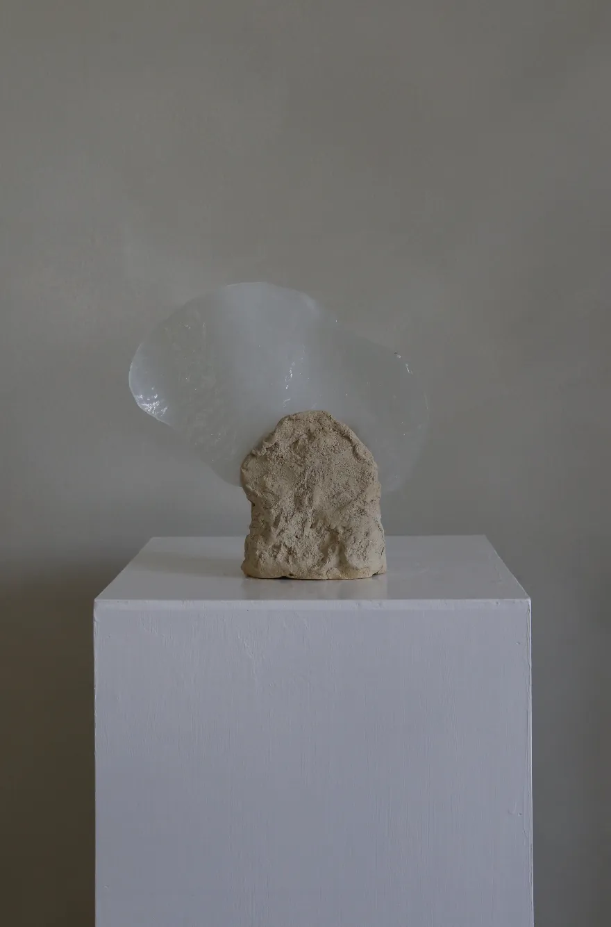 Evoking the ethereal quality of a drifting cloud, this amorphic sculpture rests on a grounded, stone-like base. A carefully carved slit reveals a fused glass element within, capturing and refracting light to create fleeting glimpses of color and luminosity. The contrast between the solid, earthy base and the delicate, radiant glass invites contemplation, as if a secret light is quietly contained within the stone. From every angle, the sculpture shifts, soft, organic curves meet the hard stone like material.