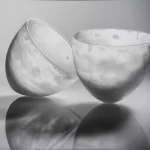They are made of two-layered hand-blown glass. The top layer of glass is slowly grid away by hand in a long process, thus leaving an uneven and tactile, cloud-like semi-transparent textured surface.