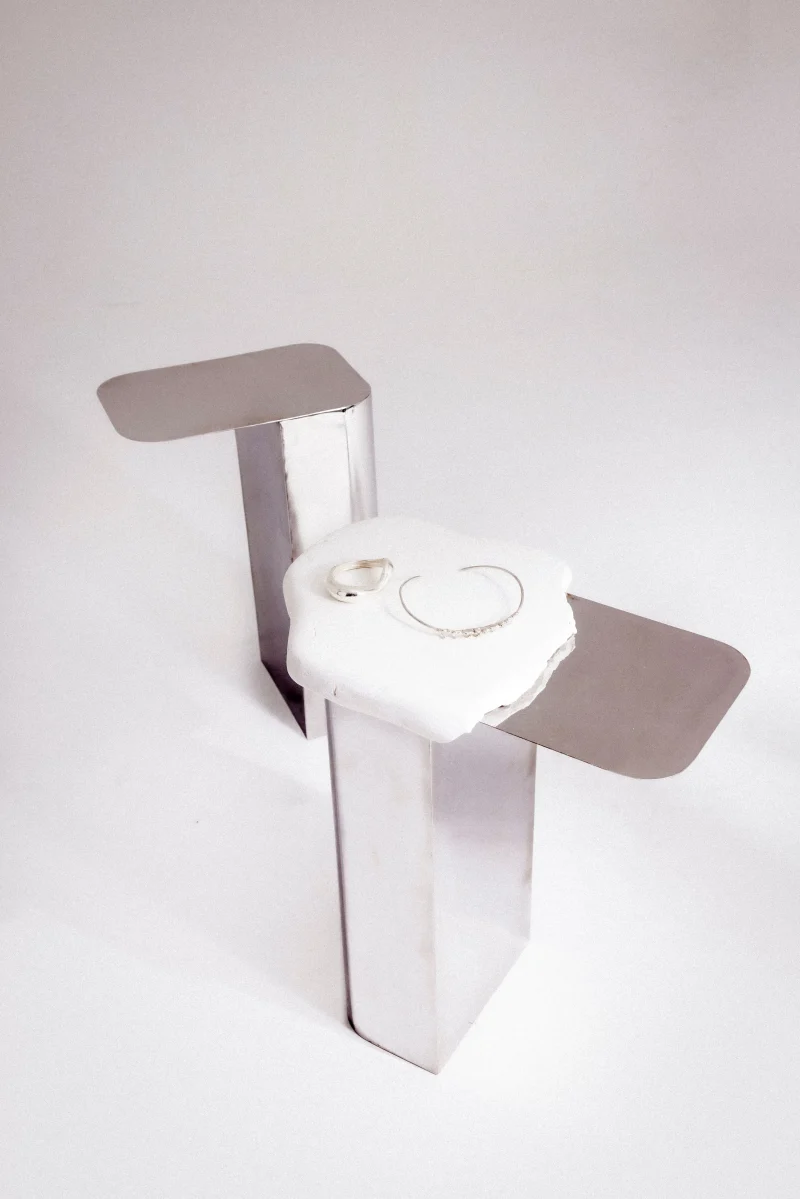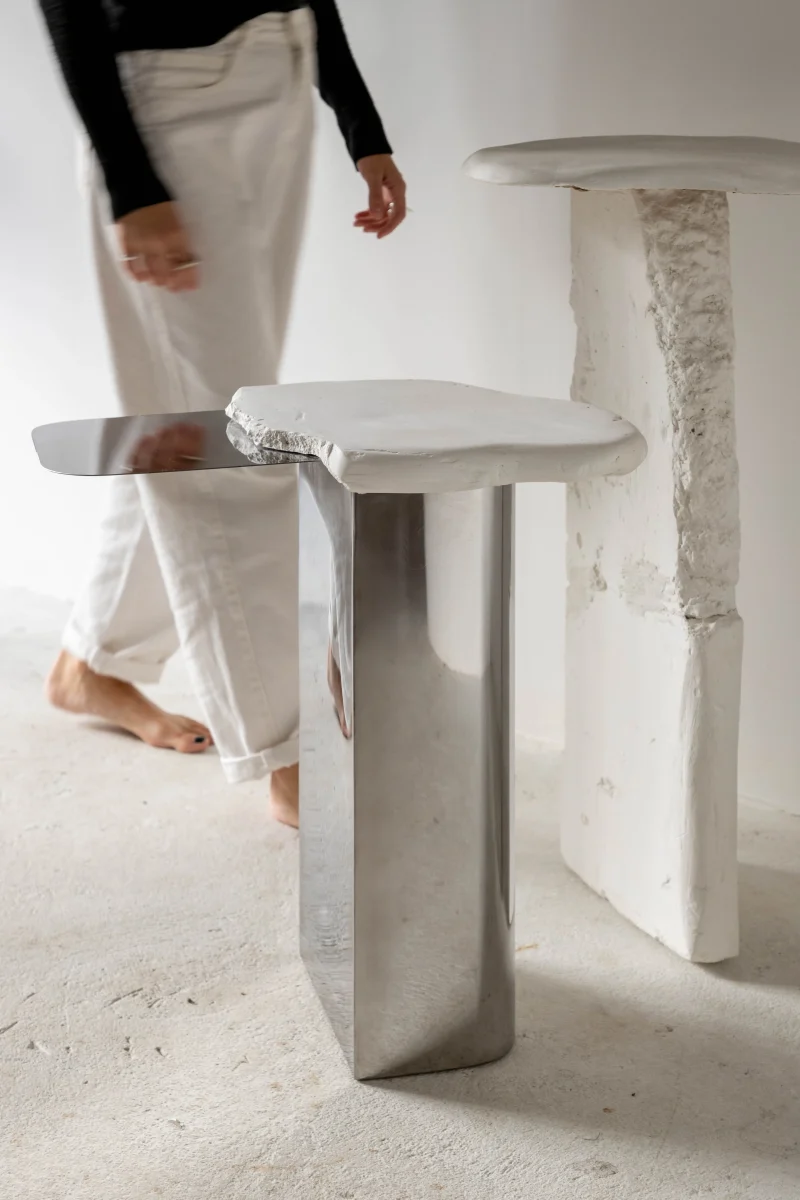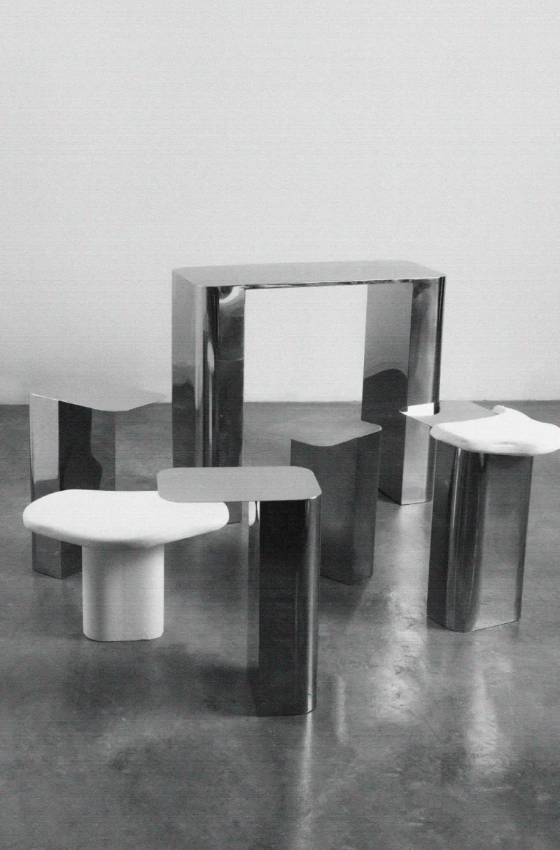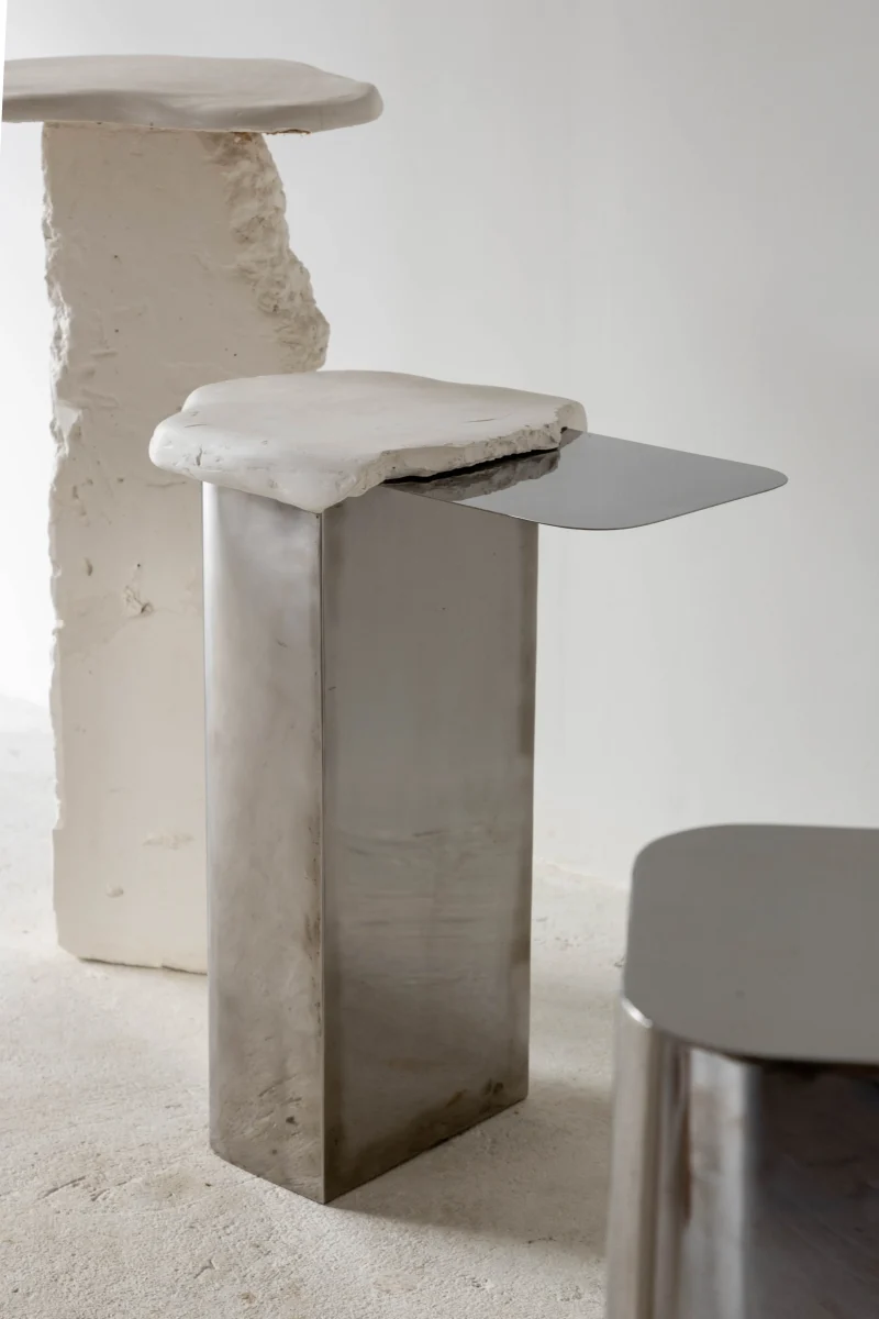 The rigidity and brightness of the metal in contrast with the organic and opaque nature of a singular compound made of resin and plaster fully developed at the studio.