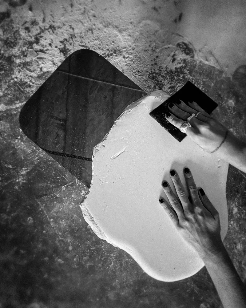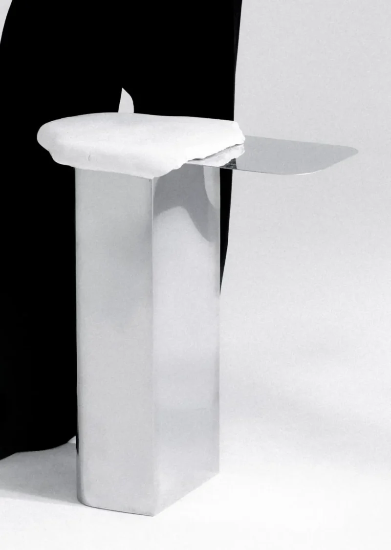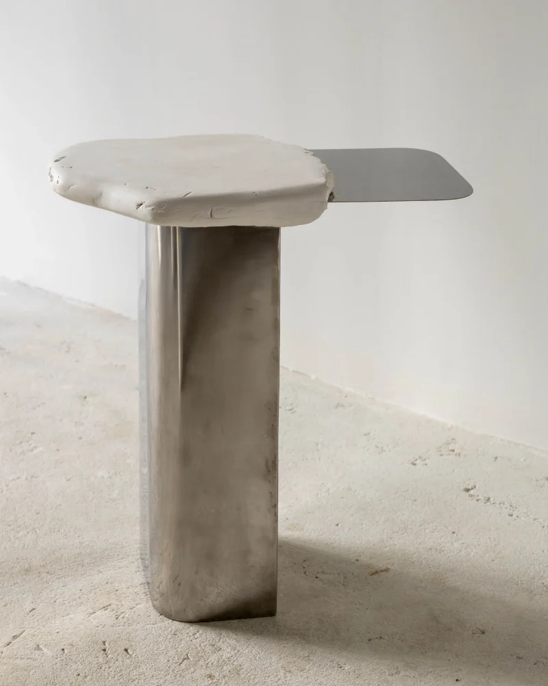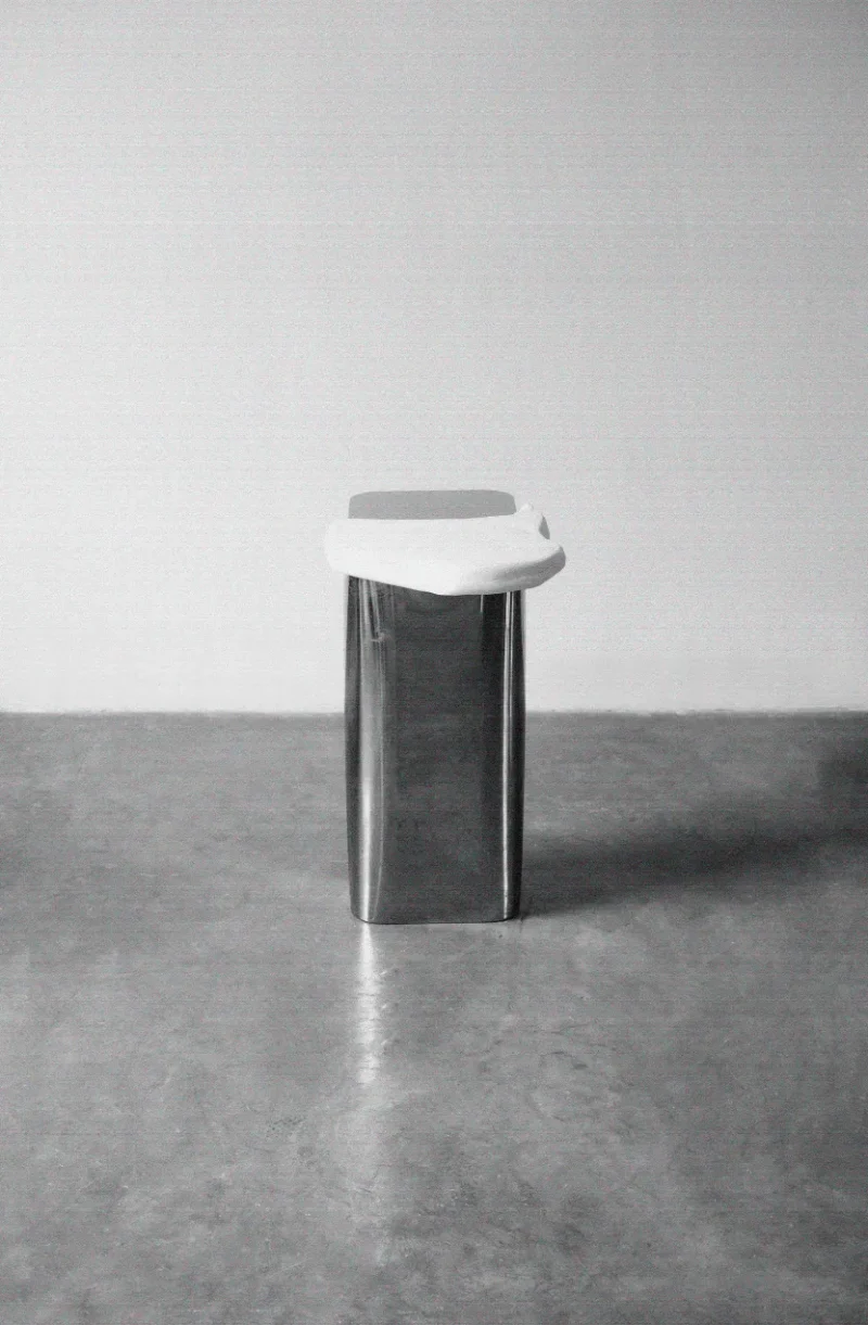 The rigidity and brightness of the metal in contrast with the organic and opaque nature of a singular compound made of resin and plaster fully developed at the studio.