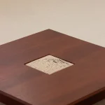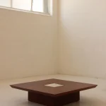 This table has a floating effect and is carried forth by its illusion of mass and it’s angular edges – both grounded by a dense cubic base, finished with a square knitted inlay (by 2am close) adding texture and softness.