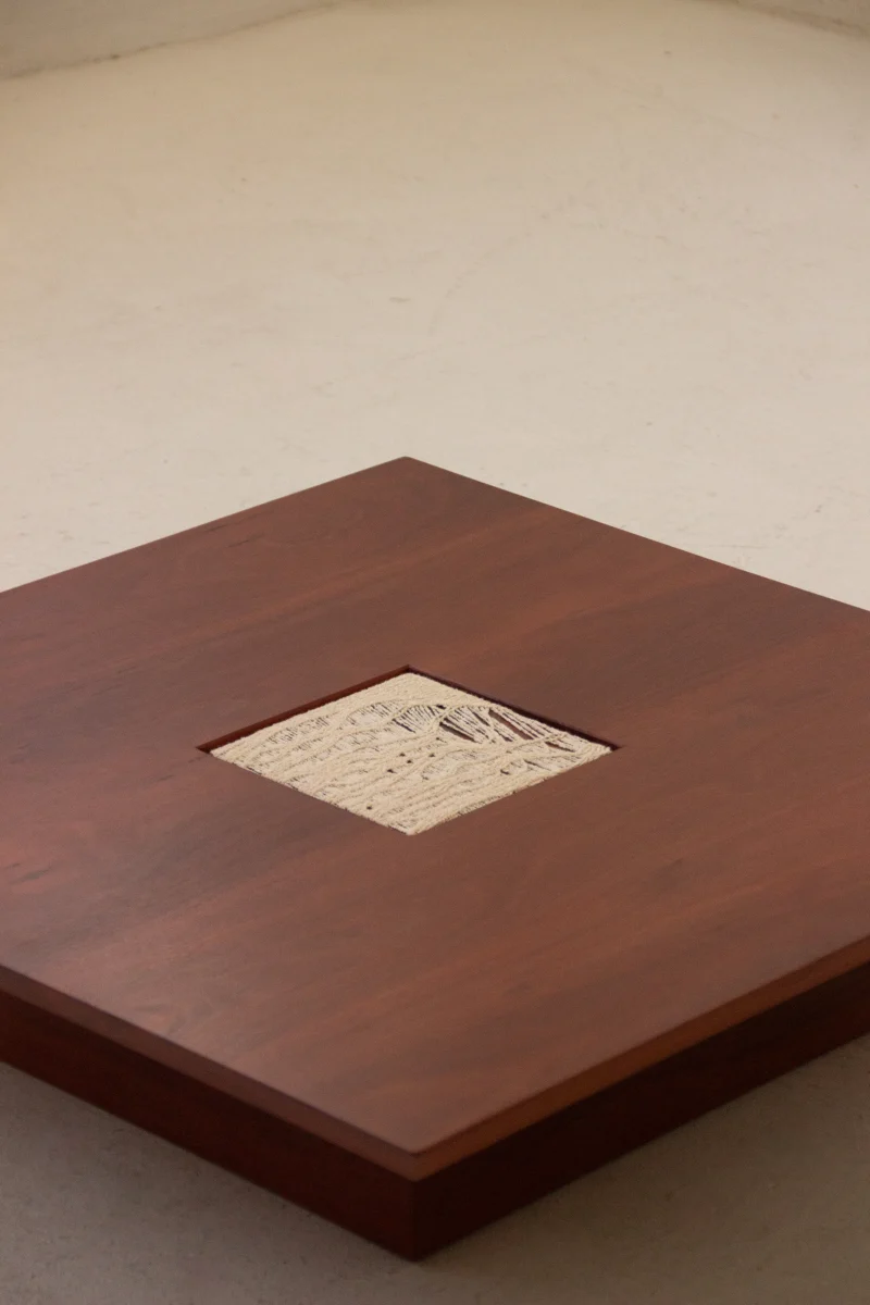 This table has a floating effect and is carried forth by its illusion of mass and it’s angular edges – both grounded by a dense cubic base, finished with a square knitted inlay (by 2am close) adding texture and softness.