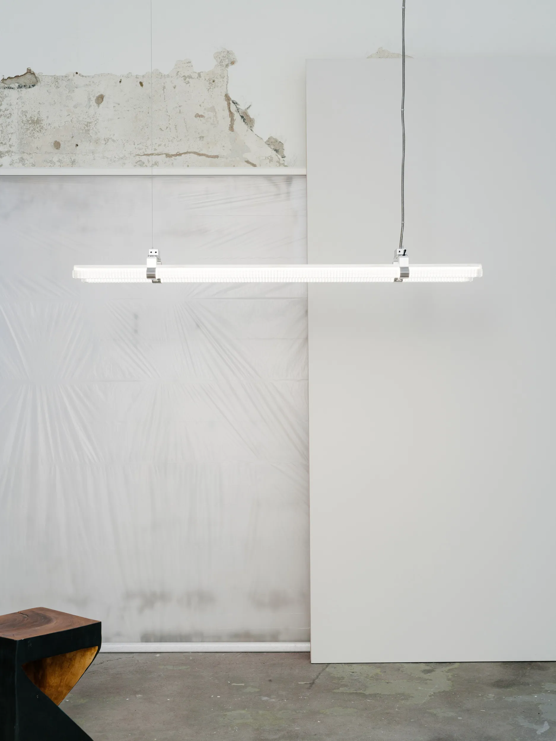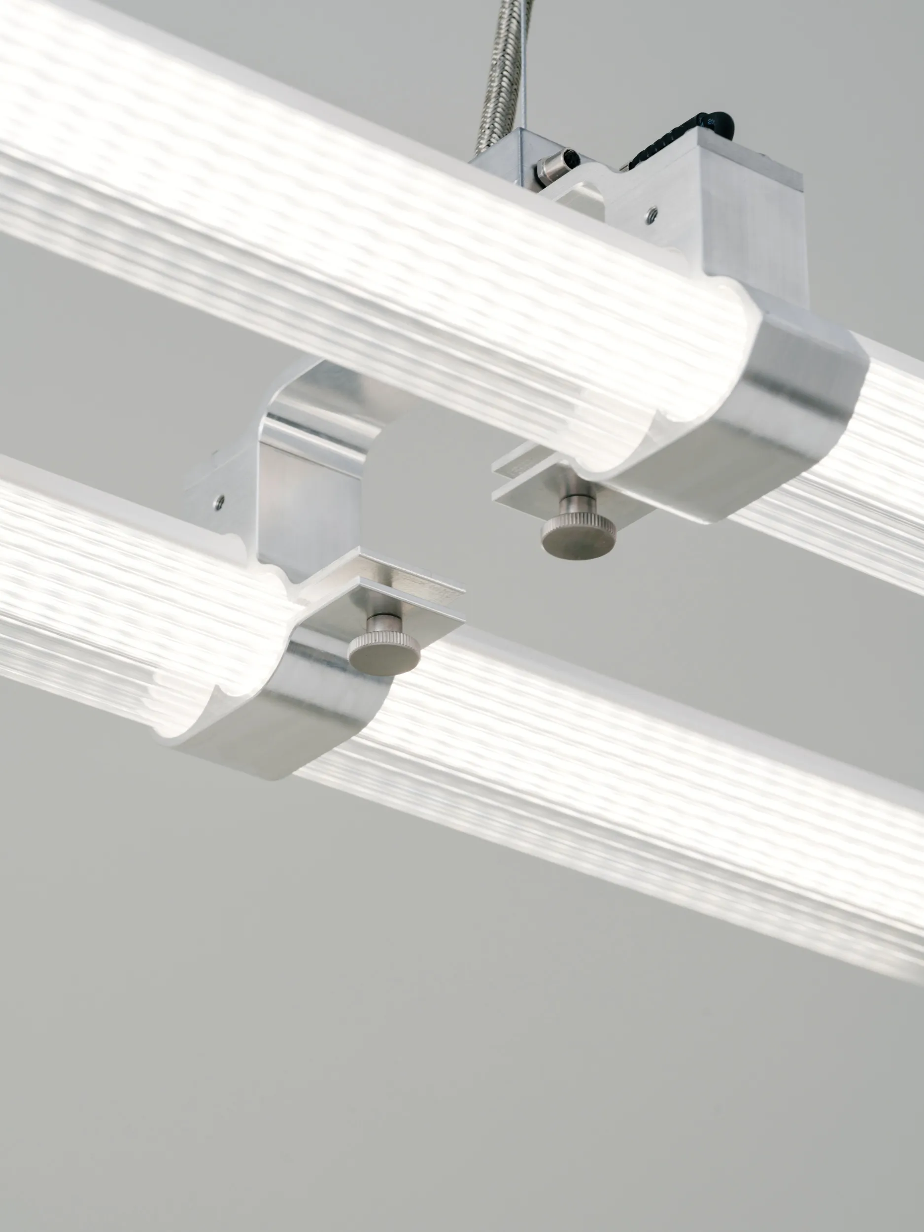 The discrete aluminum support clamps and brackets combine to make a streamlined lamp reminiscent of construction ­systems, allowing for numerous configurations of vertical and horizontal pendants and wall sconces. The design is distinct yet versatile, suitable as stand-out pieces or for project-scale deployment.