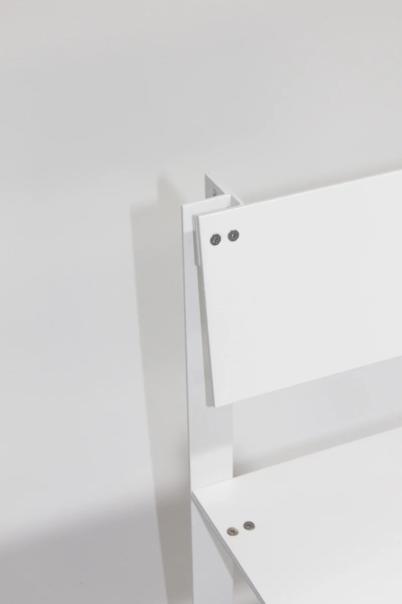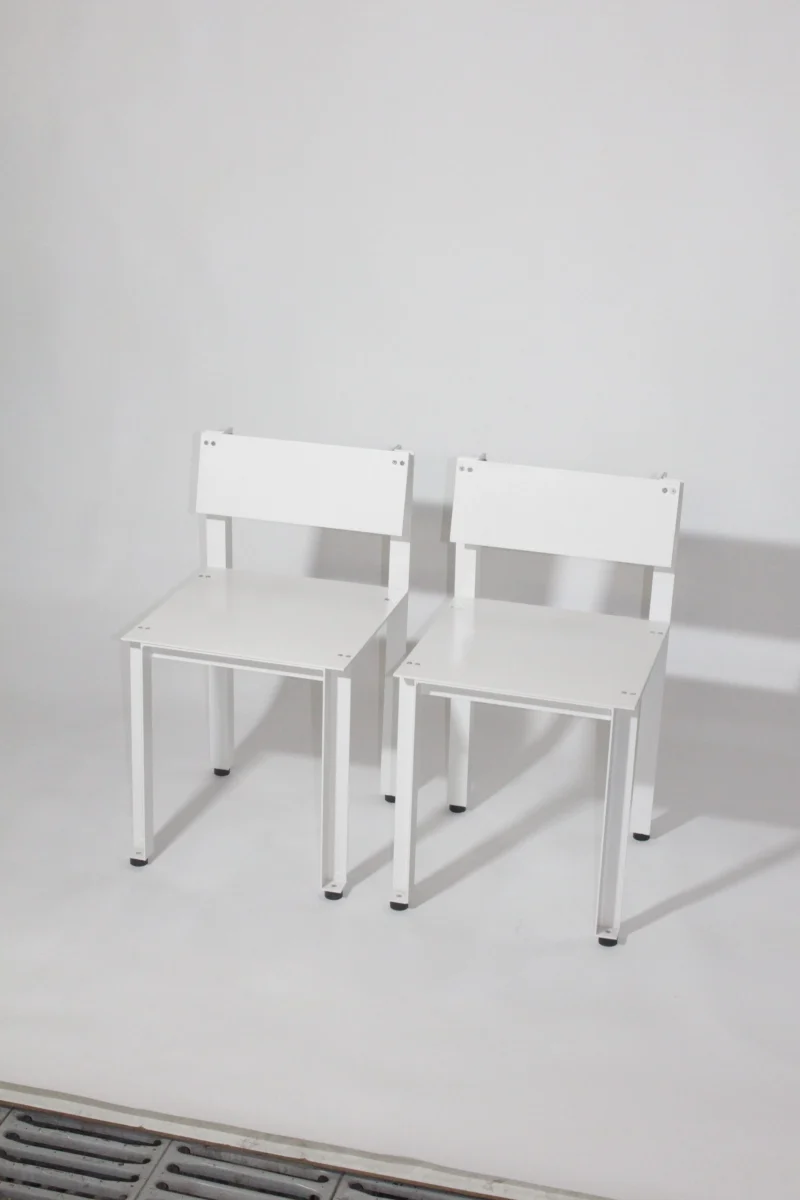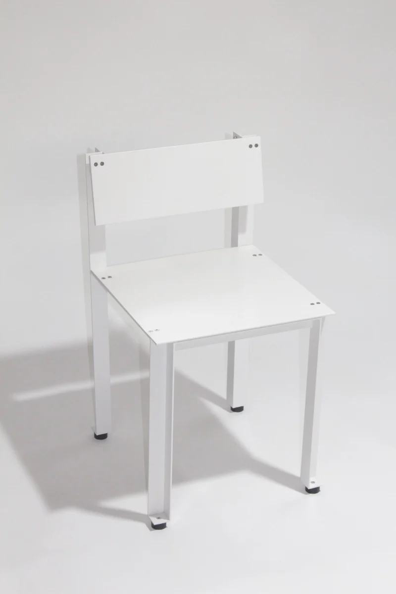The CANTO series by Luiz Solano is made up of parts made from 38 x 38 mm aluminum angles and 3 mm thick aluminum plates. The angles are welded, the plates are screwed to the structure and rubber discs are screwed under the legs of the pieces to accommodate them on the floor.