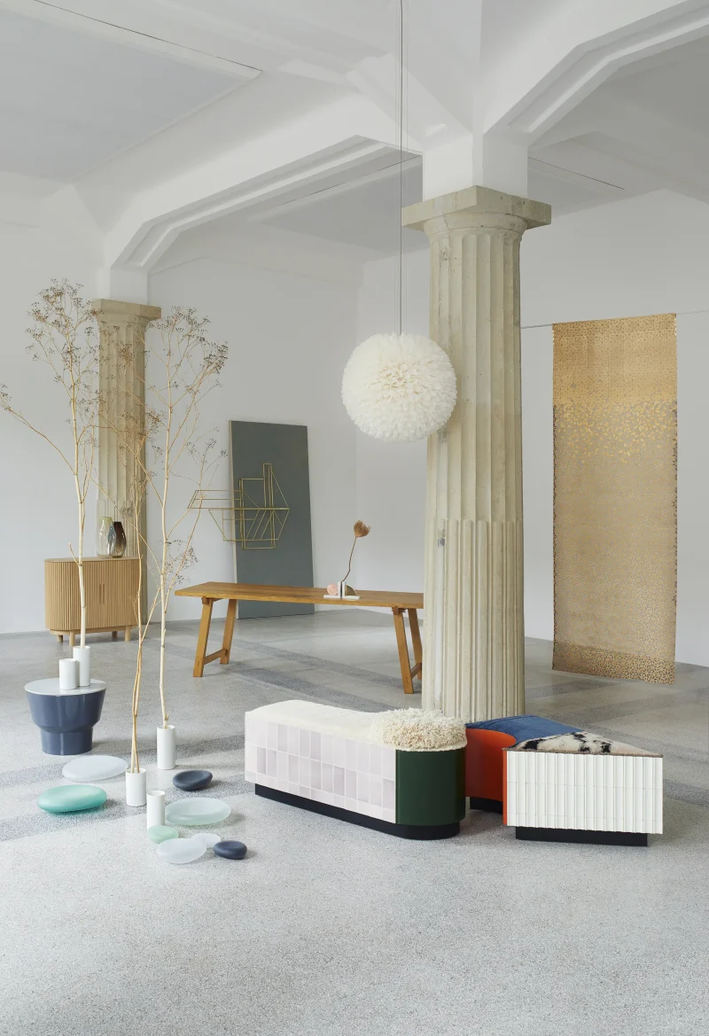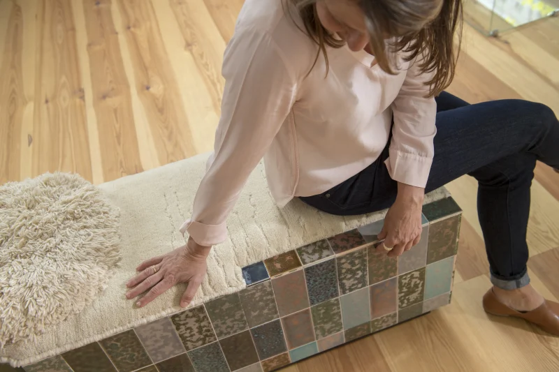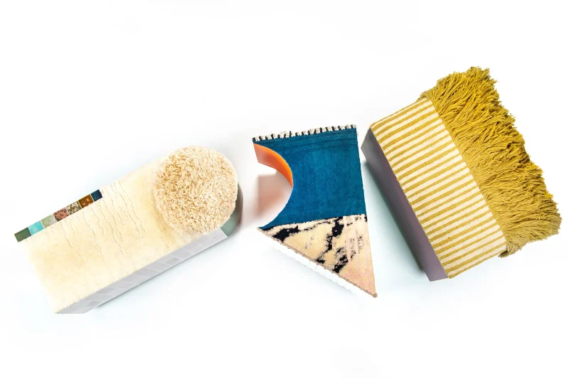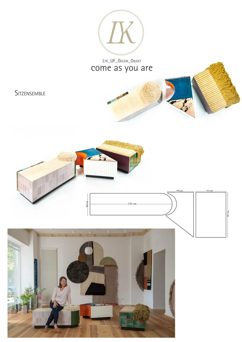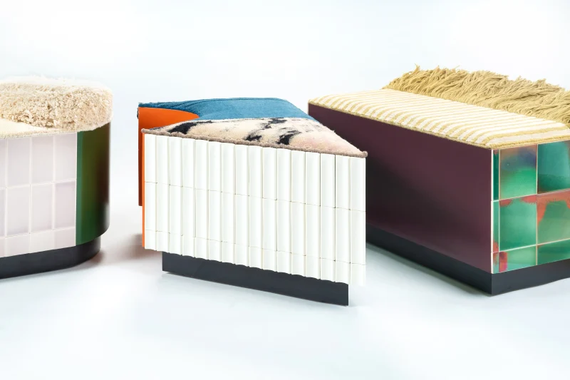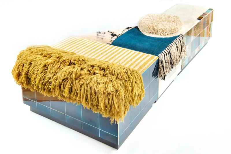 Presenting a radical interpretation of seating, the three-piece bench ensemble epitomizes eclecticism with its captivating blend of textures. Crafted by Berlin-based Lyk Carpet, this design showcases the dynamic interplay of carpets and handmade tiles from the renowned Golem brand. Embracing the versatility of wool, this creation offers a textured journey, catering to diverse spaces with an avant-garde touch.