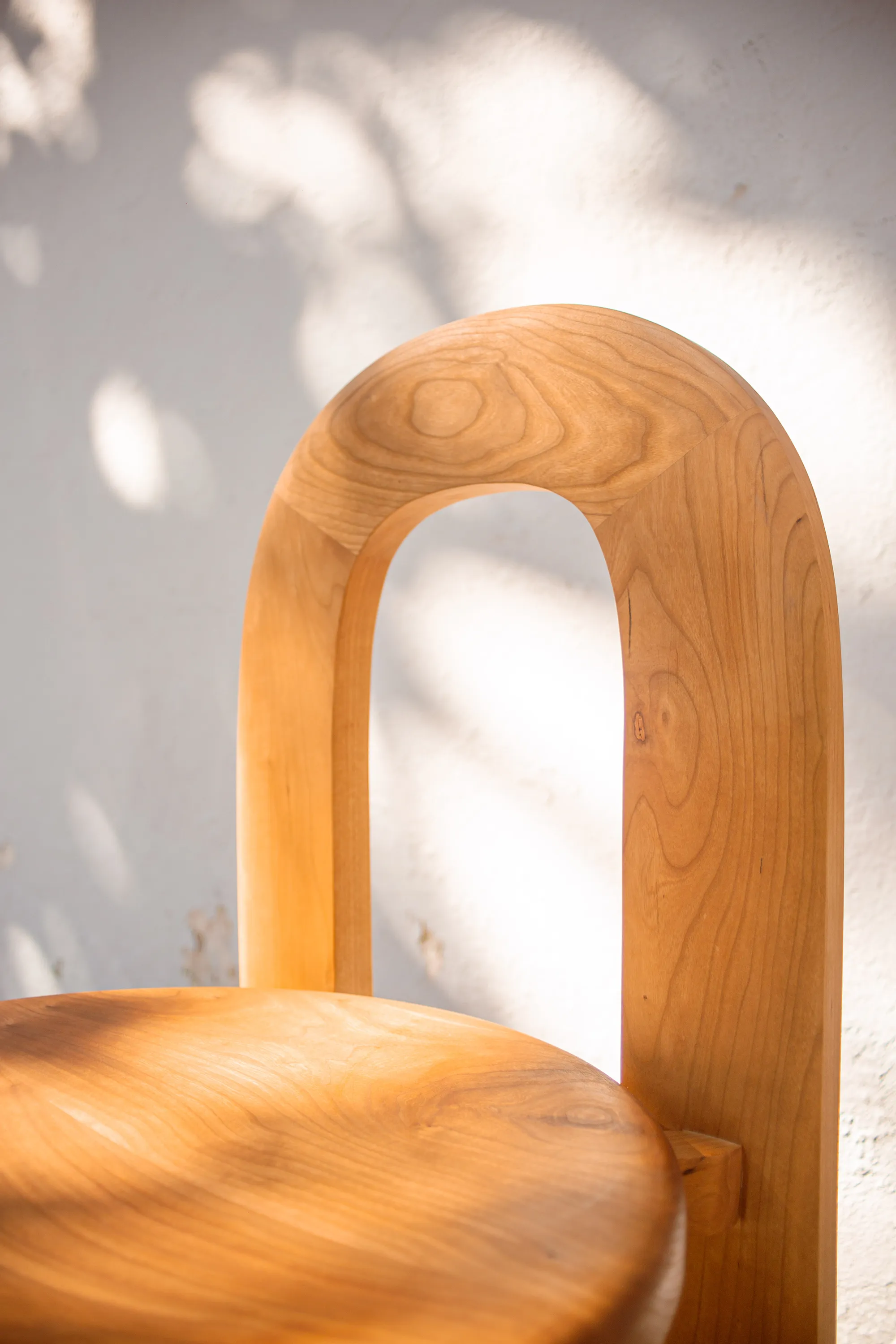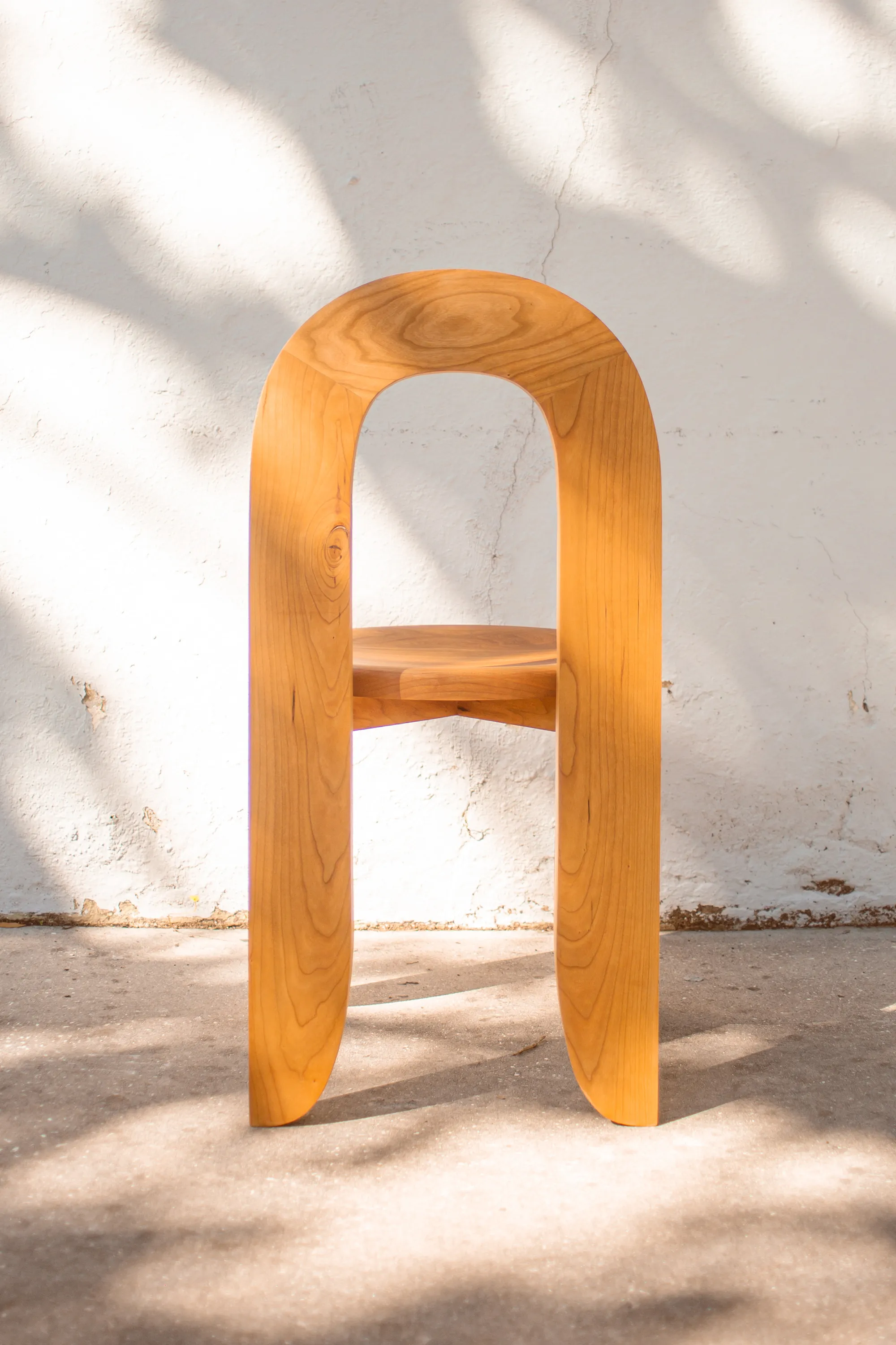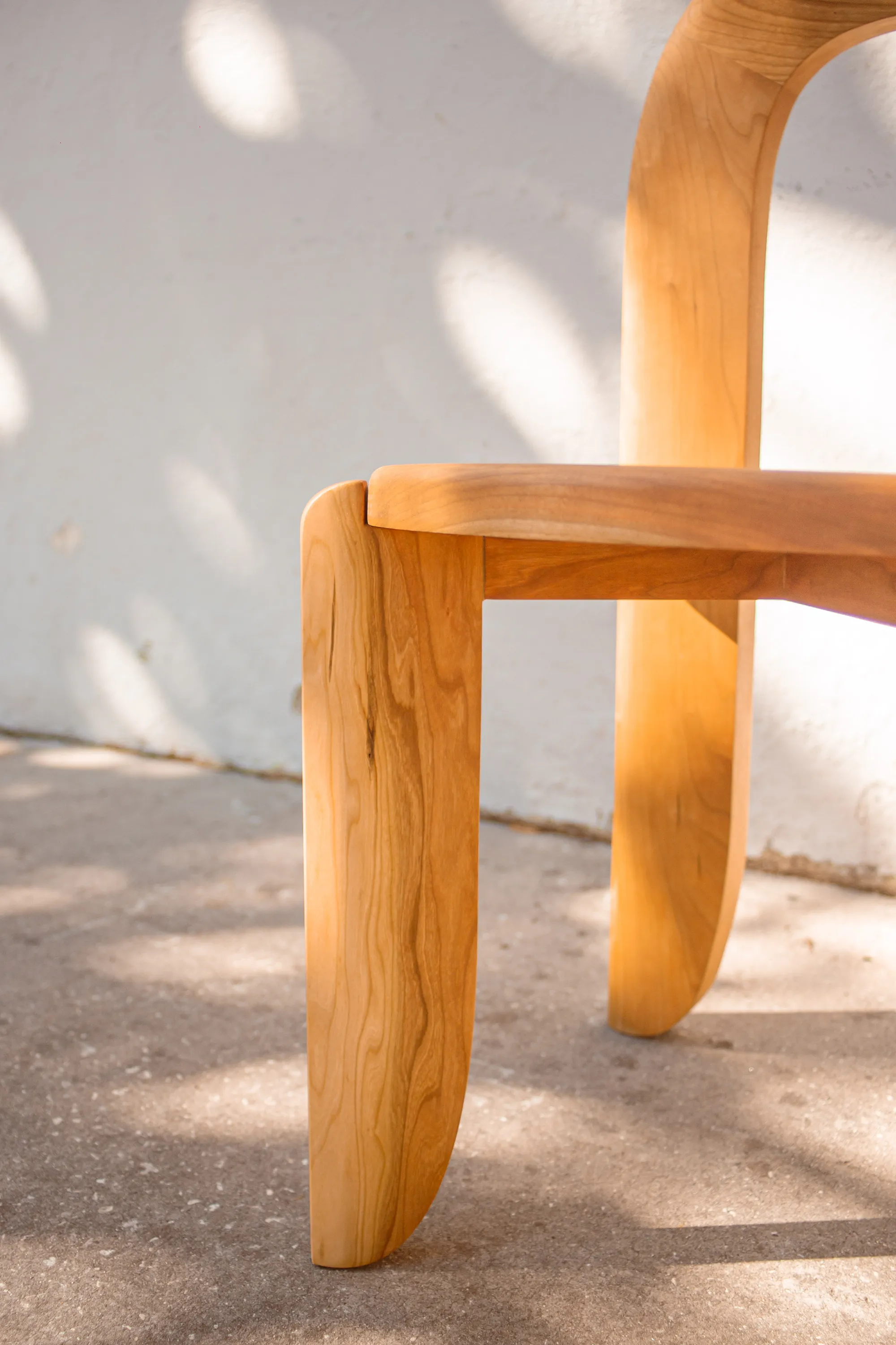 Crafted in solid cherry wood, the chair’s seat is CNC-carved for precision, while the frame is hand-shaped with an angle grinder and refined with files, giving each edge its softened but intentional character. The warm tone of the cherry was chosen to harmonize with the concrete and desert landscapes that inspired its design.