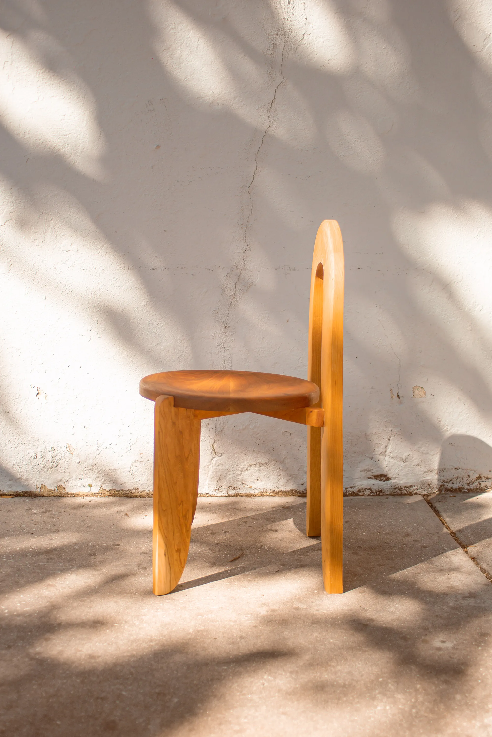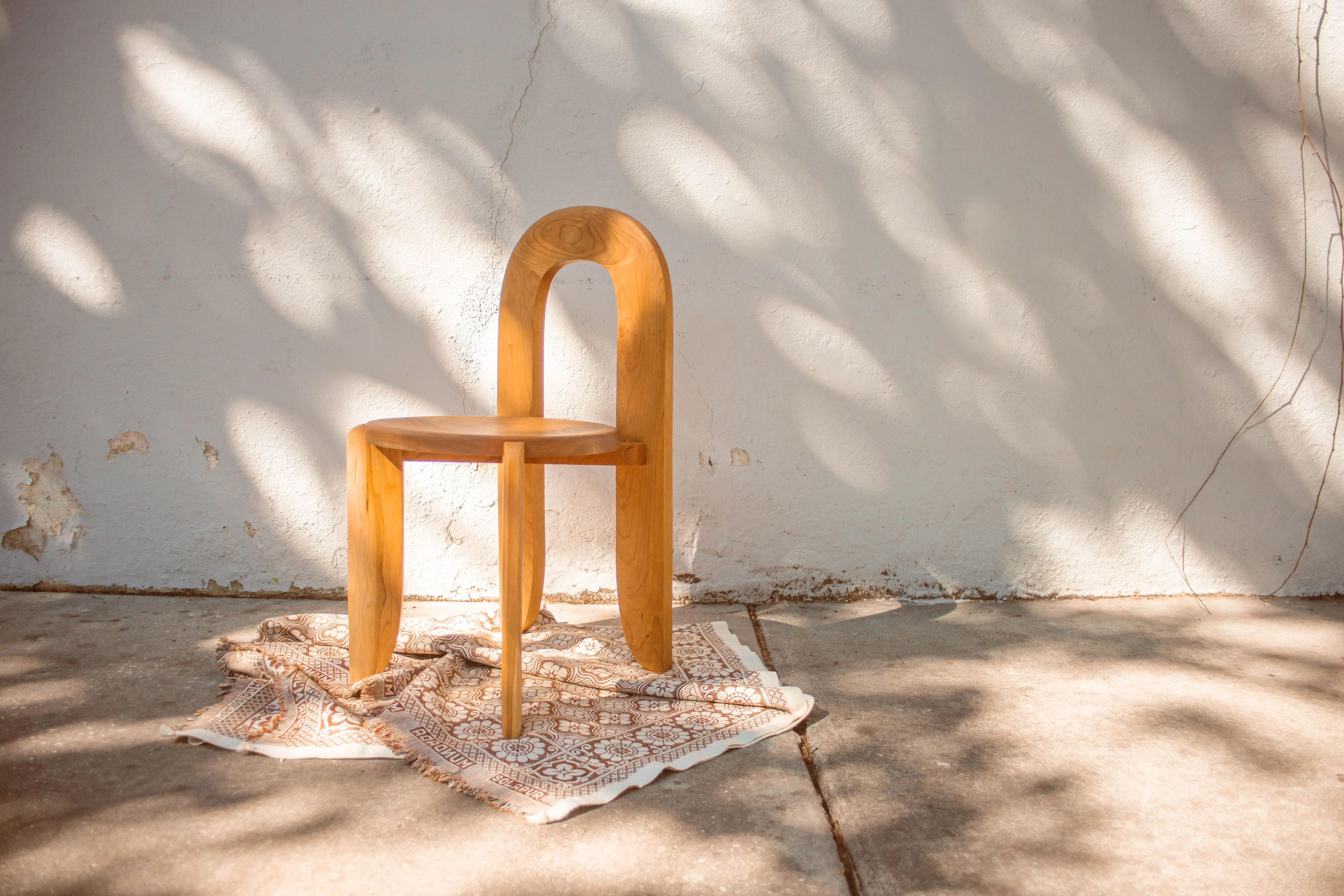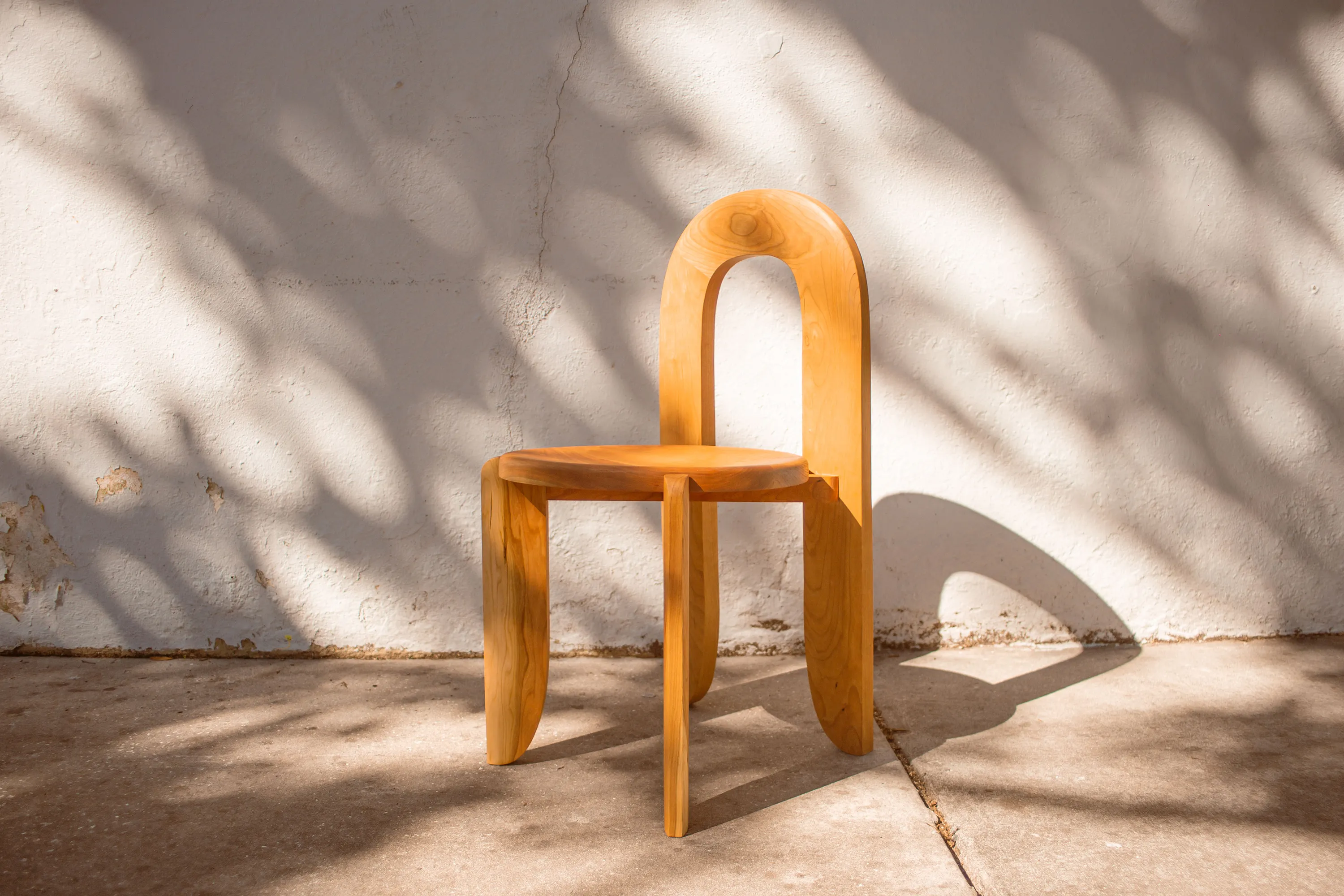 Crafted in solid cherry wood, the chair’s seat is CNC-carved for precision, while the frame is hand-shaped with an angle grinder and refined with files, giving each edge its softened but intentional character. The warm tone of the cherry was chosen to harmonize with the concrete and desert landscapes that inspired its design.