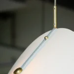The flecked paper is combined with warm brass details and hand-blown opal ellipsoid glass shades, illuminating the fixture. The pearl-like opal shades add a touch of ethereal beauty and softly diffuses the light, with the level of diffusion varying based on the angular direction of the shades and the translucency.