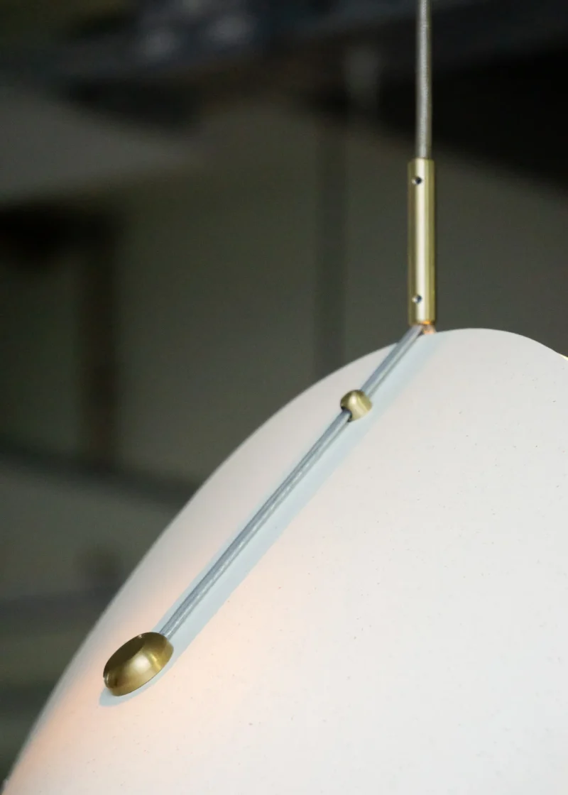 The flecked paper is combined with warm brass details and hand-blown opal ellipsoid glass shades, illuminating the fixture. The pearl-like opal shades add a touch of ethereal beauty and softly diffuses the light, with the level of diffusion varying based on the angular direction of the shades and the translucency.