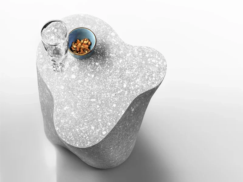 The table is made from a durable composite material developed through experimentation. It has a concrete-like appearance with a tactile, raw texture, yet remains slightly elastic, making it resistant to cracking and suitable for everyday use. The surface embraces natural irregularities rather than concealing them, giving each piece a distinct character.