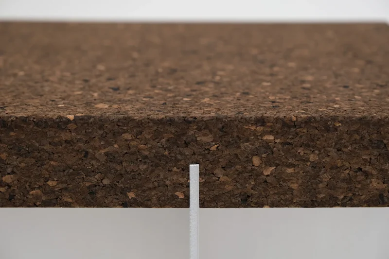The collection pairs the tactile warmth of Portuguese cork with the precision and sleekness of satin-finished aluminum, creating pieces that emphasize both functionality and material expression. Each piece integrates aluminum elements as structural supports. The metal’s diffuse sheen adds a sense of lightness, while its sharp, filigree edges juxtapose the soft, grooved cork surfaces that form the seating.