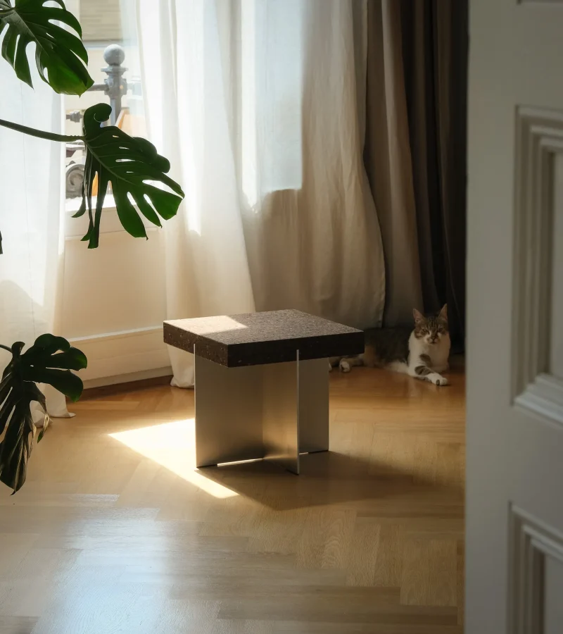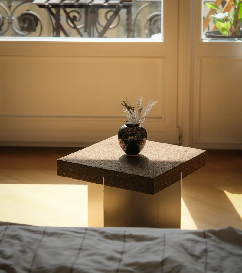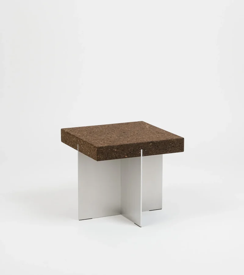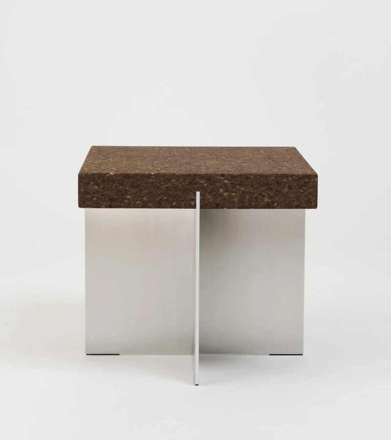A sculptural side table design within the “Collection Cork X” by Germany-based designer Robert Megel fuses cork and metal in a most minimalistic joinery.