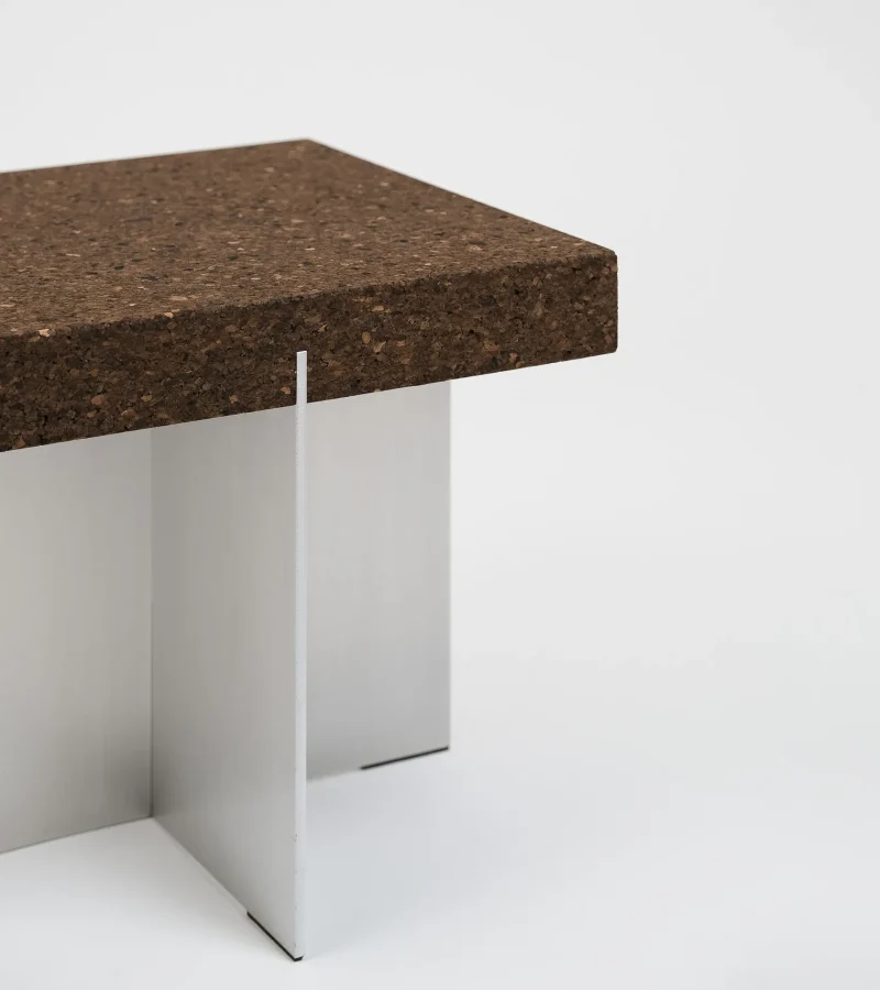The collection pairs the tactile warmth of Portuguese cork with the precision and sleekness of satin-finished aluminum, creating pieces that emphasize both functionality and material expression. Each piece integrates aluminum elements as structural supports. The metal’s diffuse sheen adds a sense of lightness, while its sharp, filigree edges juxtapose the soft, grooved cork surfaces that form the seating.