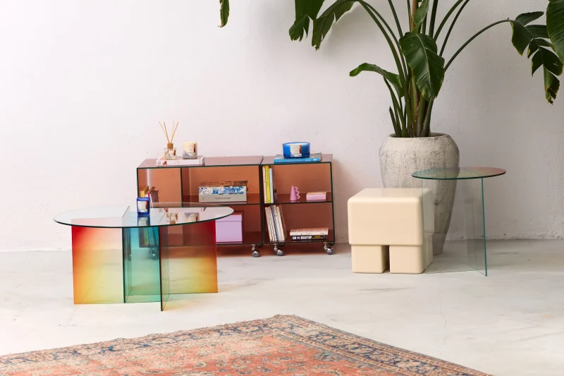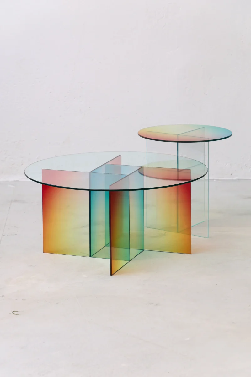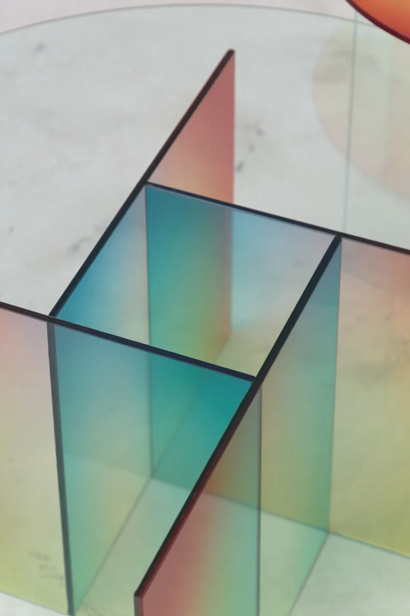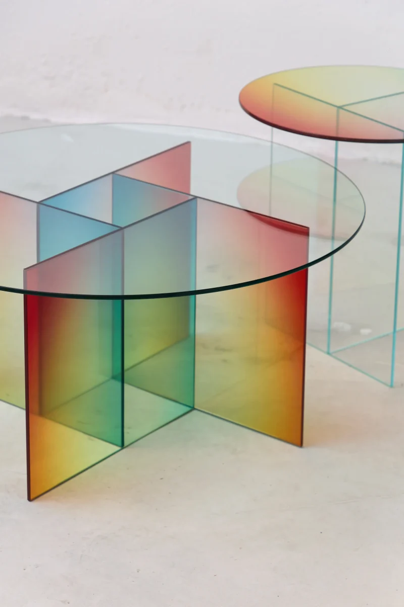 The inspiration behind the Cosmos Coffee Table stems from the idea that different colors and ideas can coexist in harmony, reflecting the vibrant texture of our multicultural environment. Prepared by talented craftsmen, this product is created by combining rainbow gradient-colored glasses using a special bonding technique.
