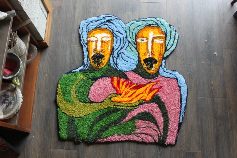 This handmade rug by Ia Liparteliani is a vibrant and unique decorative piece that adds a pop of color to any room. Its special design and lively hues make it a standout feature, perfect for wall hanging. Bring a touch of artisanal charm into your space with this one-of-a-kind rug.