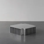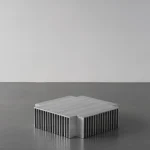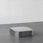 CPU Low Coffee Table is part of “ALUCUTS” (2021 – 2023) furniture series, showcasing simple yet sturdy bolted assemblies of 12mm squared cuts of aluminium plates. The cuts are organized empirically until the piece reveals itself. Craft is kept to its bare minimum: the shiny edges are scarred by the blade, and contrast with the brushed finish; countersunk Allen bolts details underline the connections.