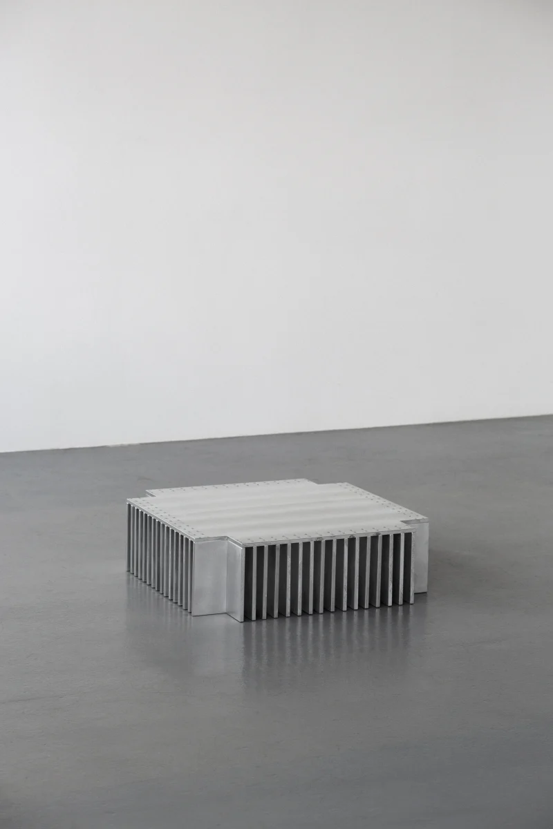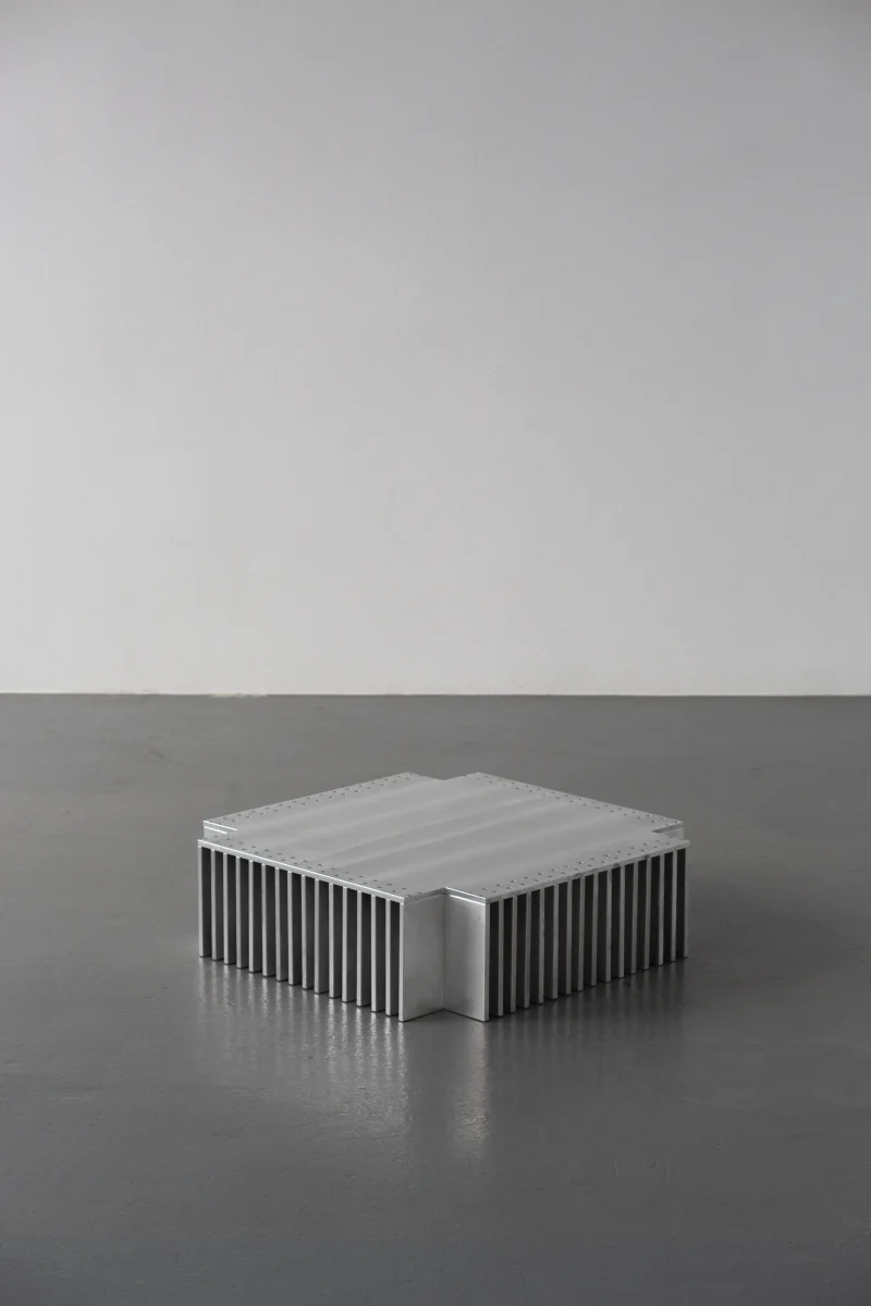 CPU Low Coffee Table is part of “ALUCUTS” (2021 – 2023) furniture series, showcasing simple yet sturdy bolted assemblies of 12mm squared cuts of aluminium plates. The cuts are organized empirically until the piece reveals itself. Craft is kept to its bare minimum: the shiny edges are scarred by the blade, and contrast with the brushed finish; countersunk Allen bolts details underline the connections.