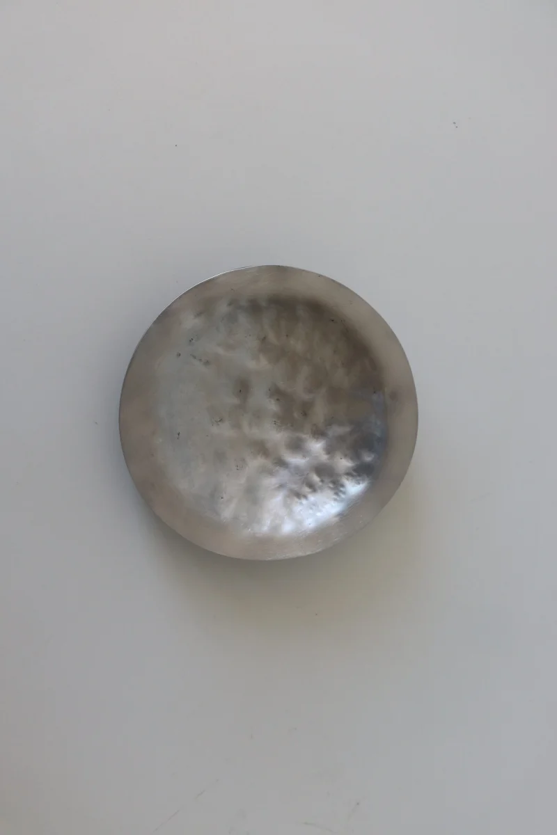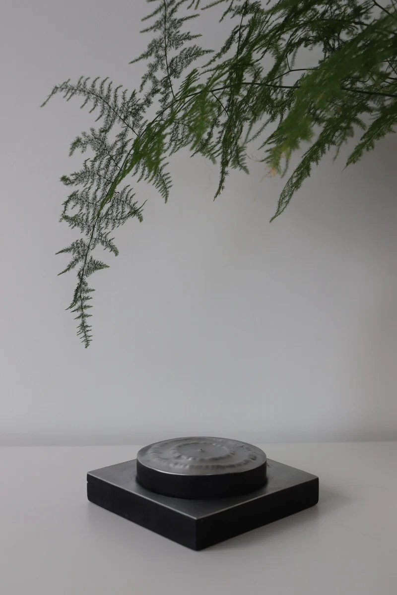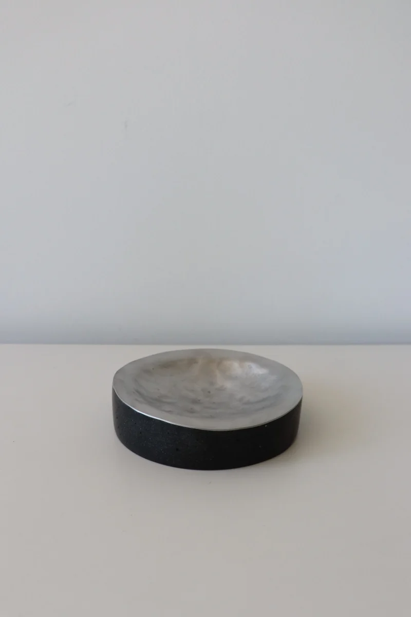 Originally from Italy, Emilia draws inspiration from her Sicilian heritage and the raw, volcanic landscapes that define the island. Her most recent series, ETNA, channels this connection to land and energy. The collection combines hand-hammered aluminium with pigmented jesmonite, using metal sheets as both form and mould. The result is a monolithic, textural piece celebrating material tension, weight, and surface irregularity.