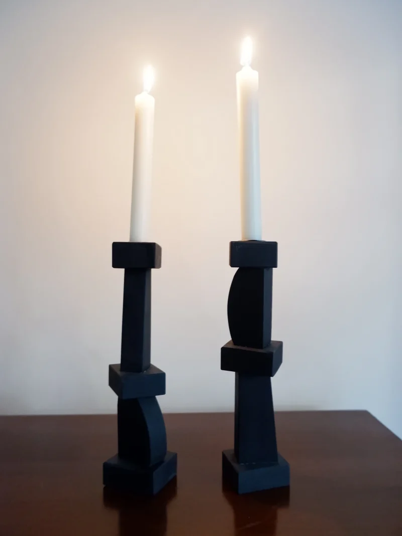 Oak Candleholders, with ebonized finish and aluminium candle cups.