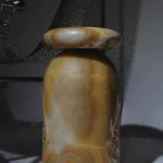 Cult stool/ side table; a hand-sculpted stone from a Mexican marble and Mexican onyx conglomerate, remits to primal sculptural-architectural language while displaying materials in a modernist manner. The piece allows for the specificity of the material’s eccentric pattern formations to rein over its final appearance. Each edition is a unique piece.