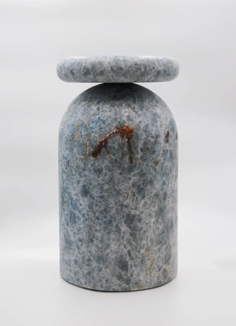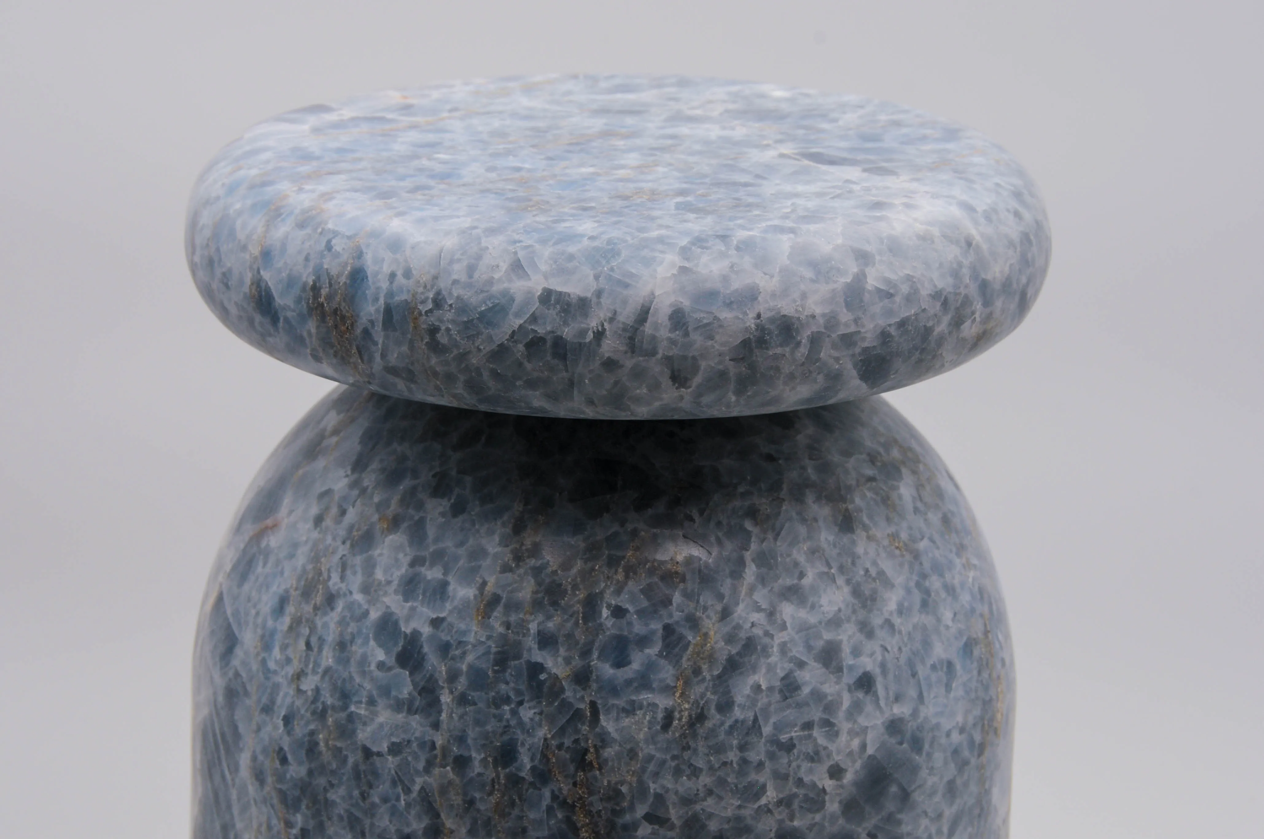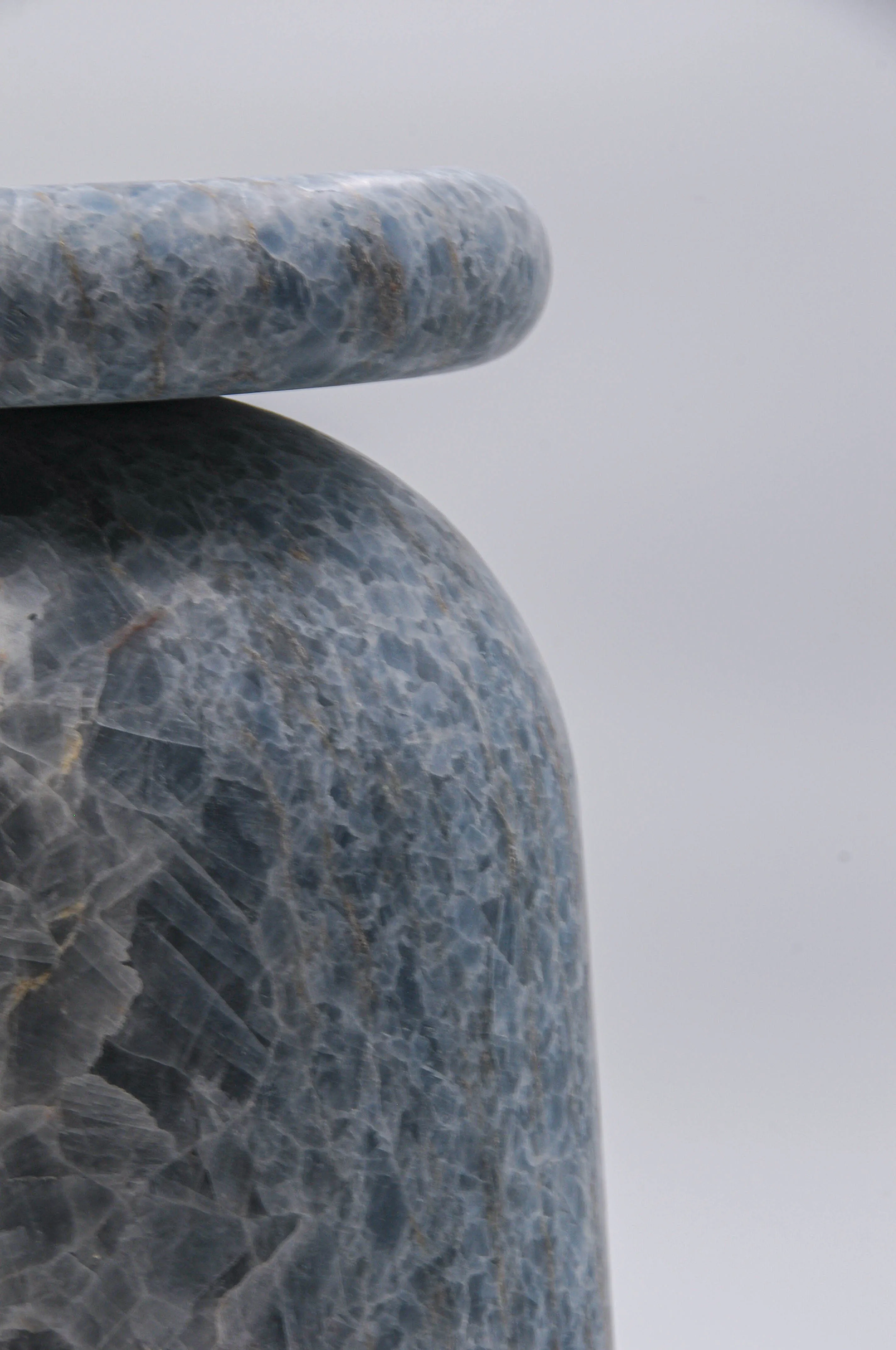 This hand-sculpted piece, made from Mexican Blue Calcite, evokes a primal sculptural-architectural language while presenting materials in a modernist fashion. Its design allows the unique, eccentric pattern formations of the material to define its final appearance, making each edition a unique work.