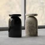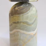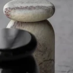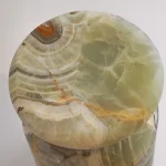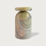 Cult stool/side table; a hand-sculpted stone from a Mexican marble and Mexican onyx conglomerate, remits to primal sculptural-architectural language while displaying materials in a modernist manner. The piece allows for the specificity of the material’s eccentric pattern formations to rein over its final appearance. Each edition is a unique piece.